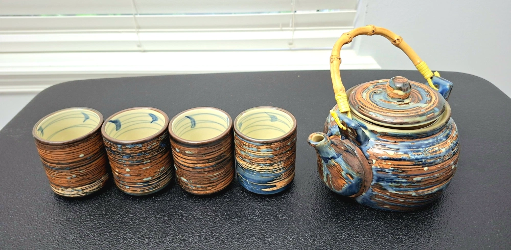 I'm selling a lovely ceramic tea set! It includes a teapot with a bamboo handle and four matching cups. The set has a unique swirl pattern in shades of brown and blue. Perfect for enjoying a relaxing cup of tea!