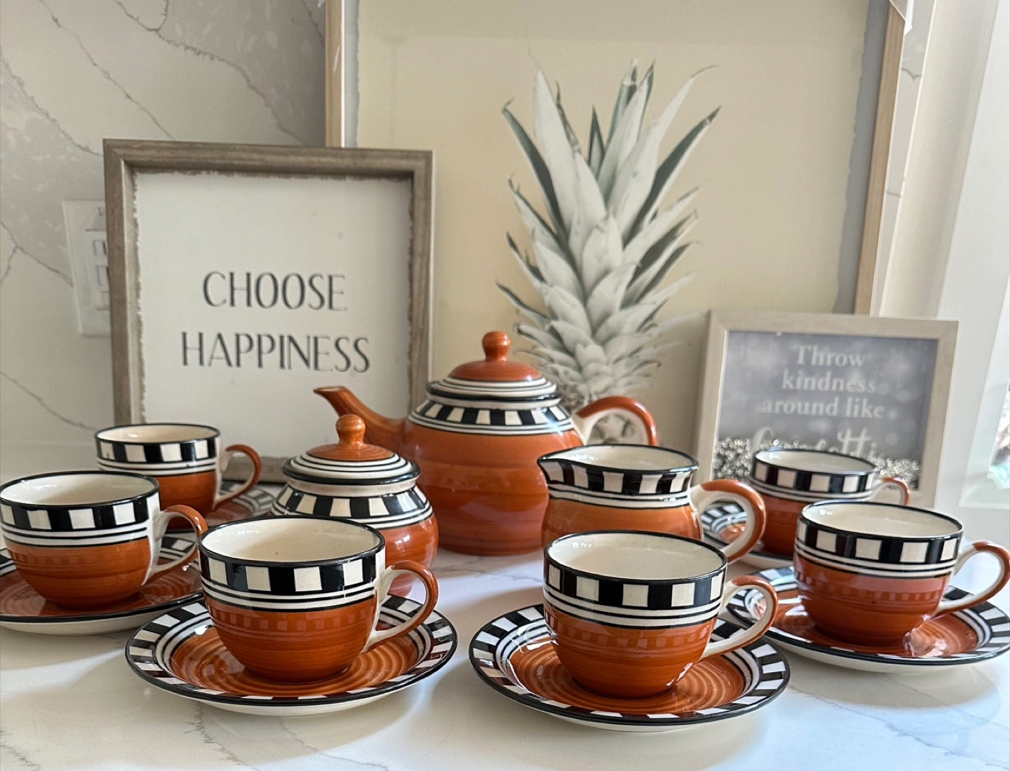 Looking to add a touch of charm to your tea time? This ceramic tea set includes a teapot, teacups with saucers, a creamer, and a sugar bowl. The set features a unique design with a mix of brown and black stripes, perfect for a cozy afternoon tea with friends or family. It's Brand new in great condition and ready to find a new home.