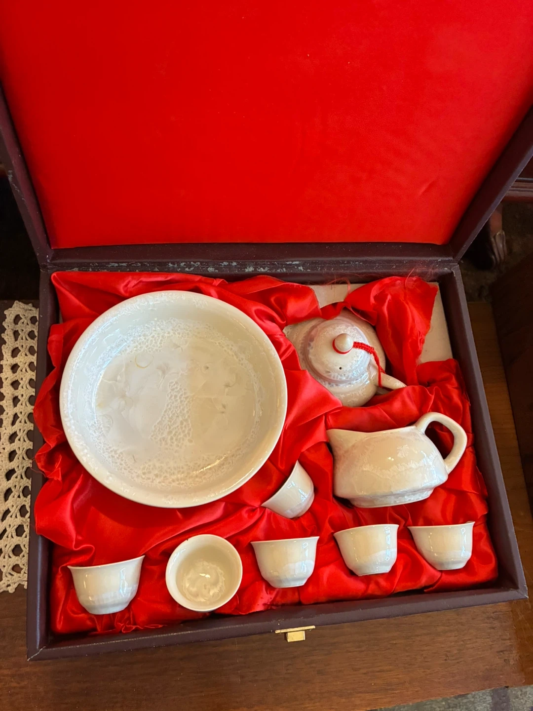 10Selling a lovely ceramic tea set, complete with its original box! The set includes a teapot, several small cups, and a larger bowl, all in a matching ceramic design. Perfect for tea lovers or as a decorative piece for your home