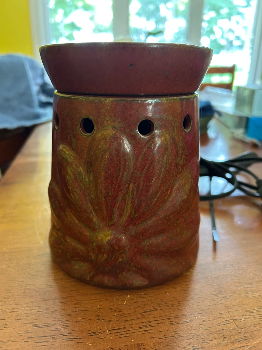 I'm selling a Scentsy ceramic wax warmer. It has a beautiful floral design and is in great condition. Perfect for adding a cozy ambiance to any room!
