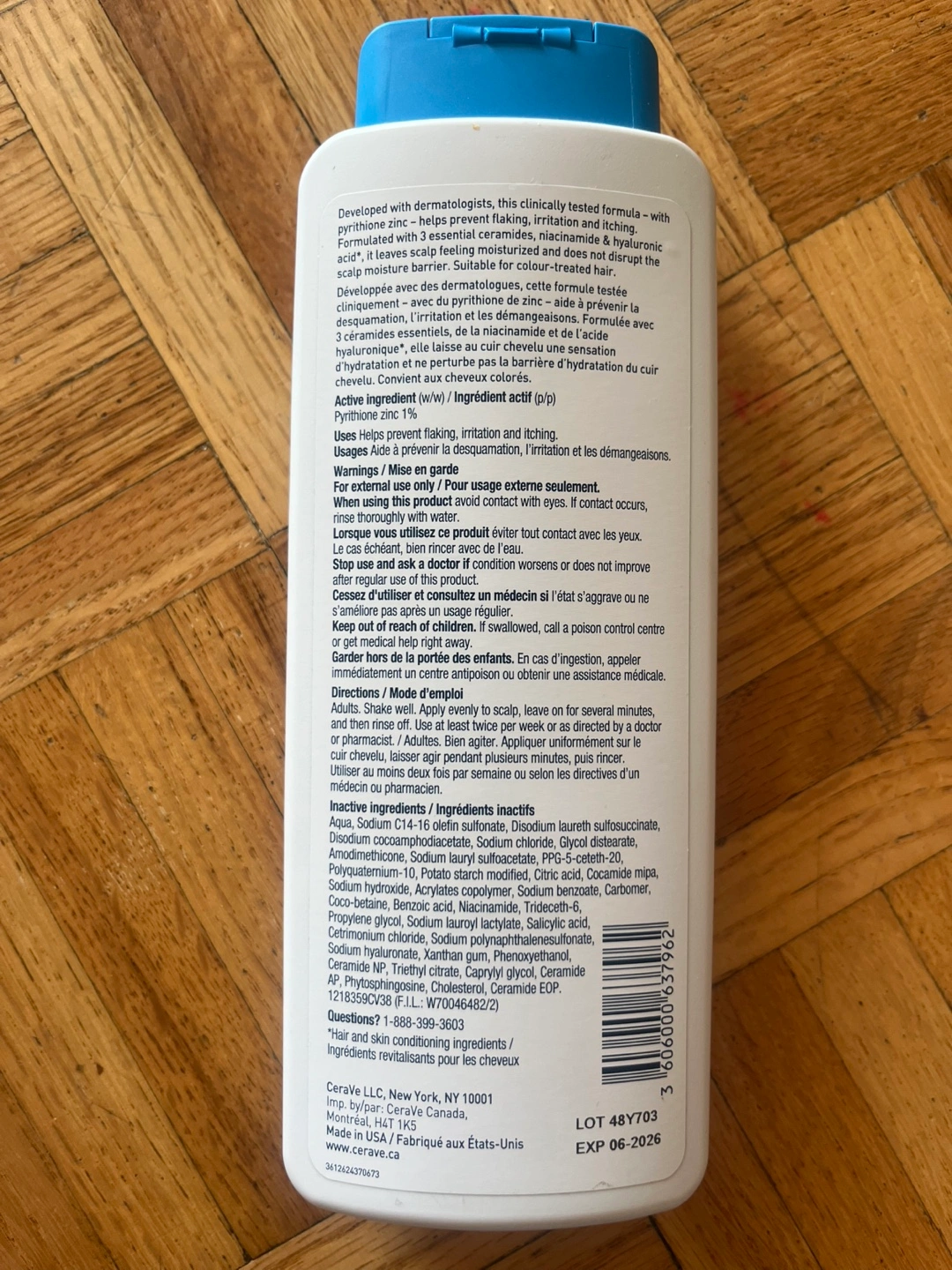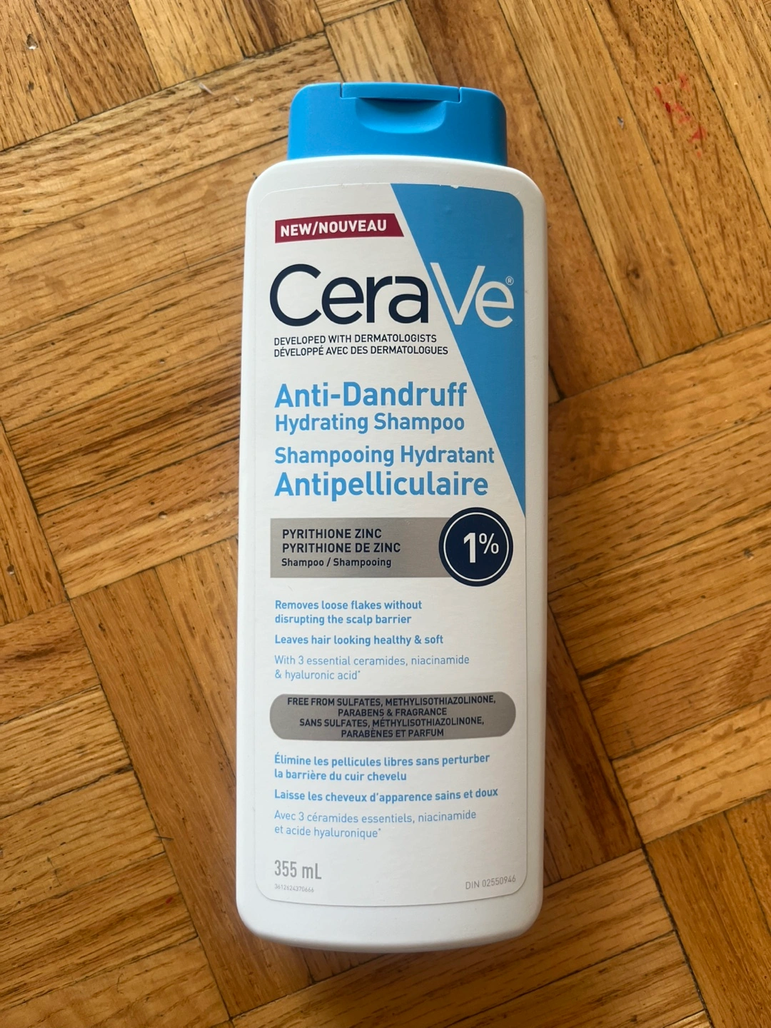 CeraVe Anti-Dandruff Hydrating Shampoo in a 355ml bottle. This shampoo contains essential ceramides, niacinamide, and hyaluronic acid. It removes loose flakes without disrupting the scalp barrier, leaving hair looking healthy and soft. The expiration date is June 2026.Cash only