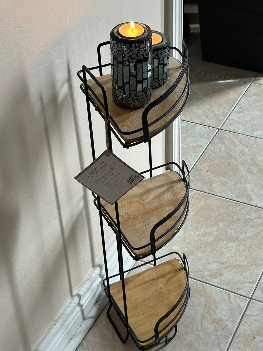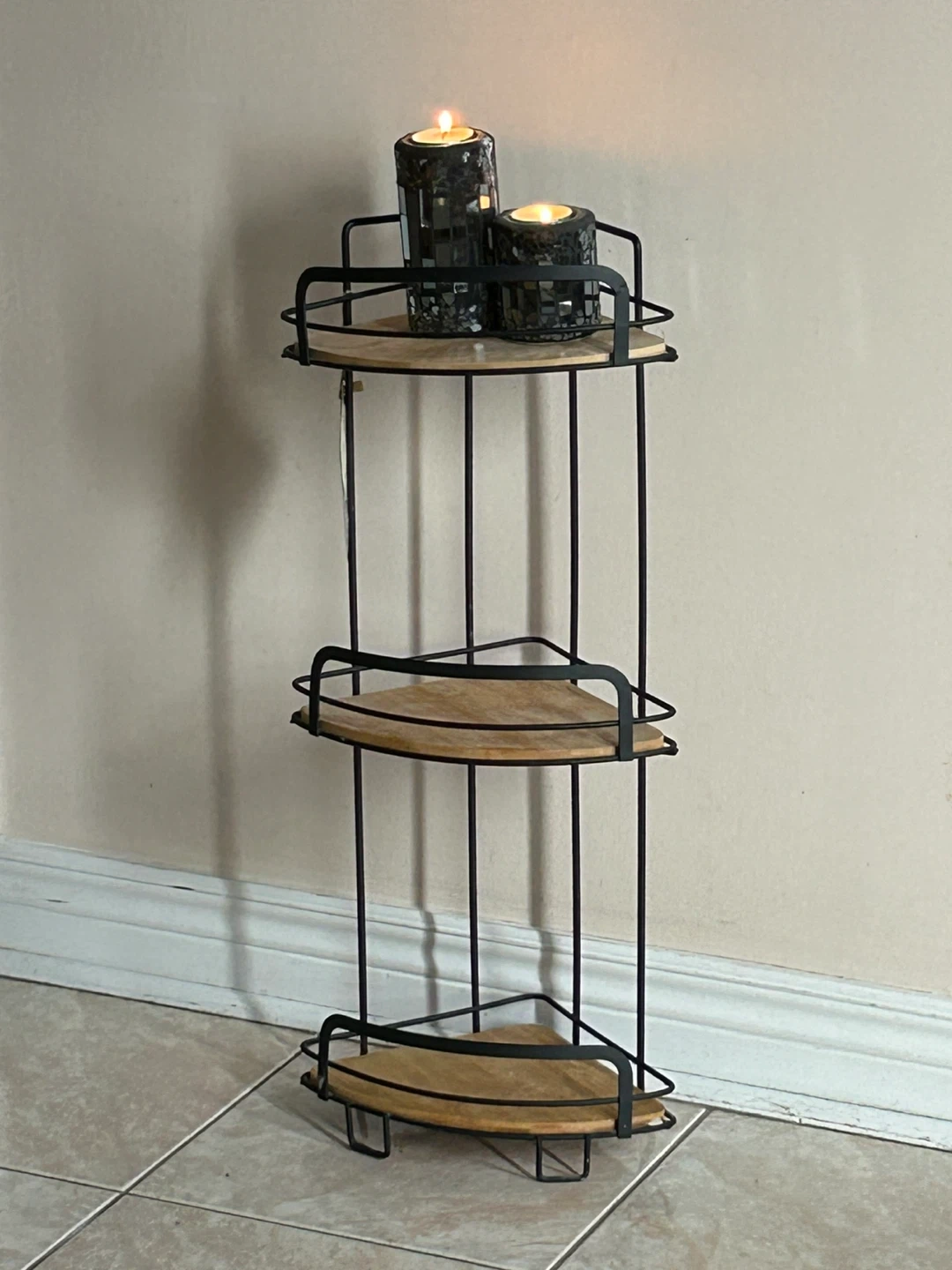 53Selling a Cerca corner shelf! It's perfect for adding some extra storage in a small space. The shelves are a light wood colour and the frame is black. It's in great condition and ready for a new home