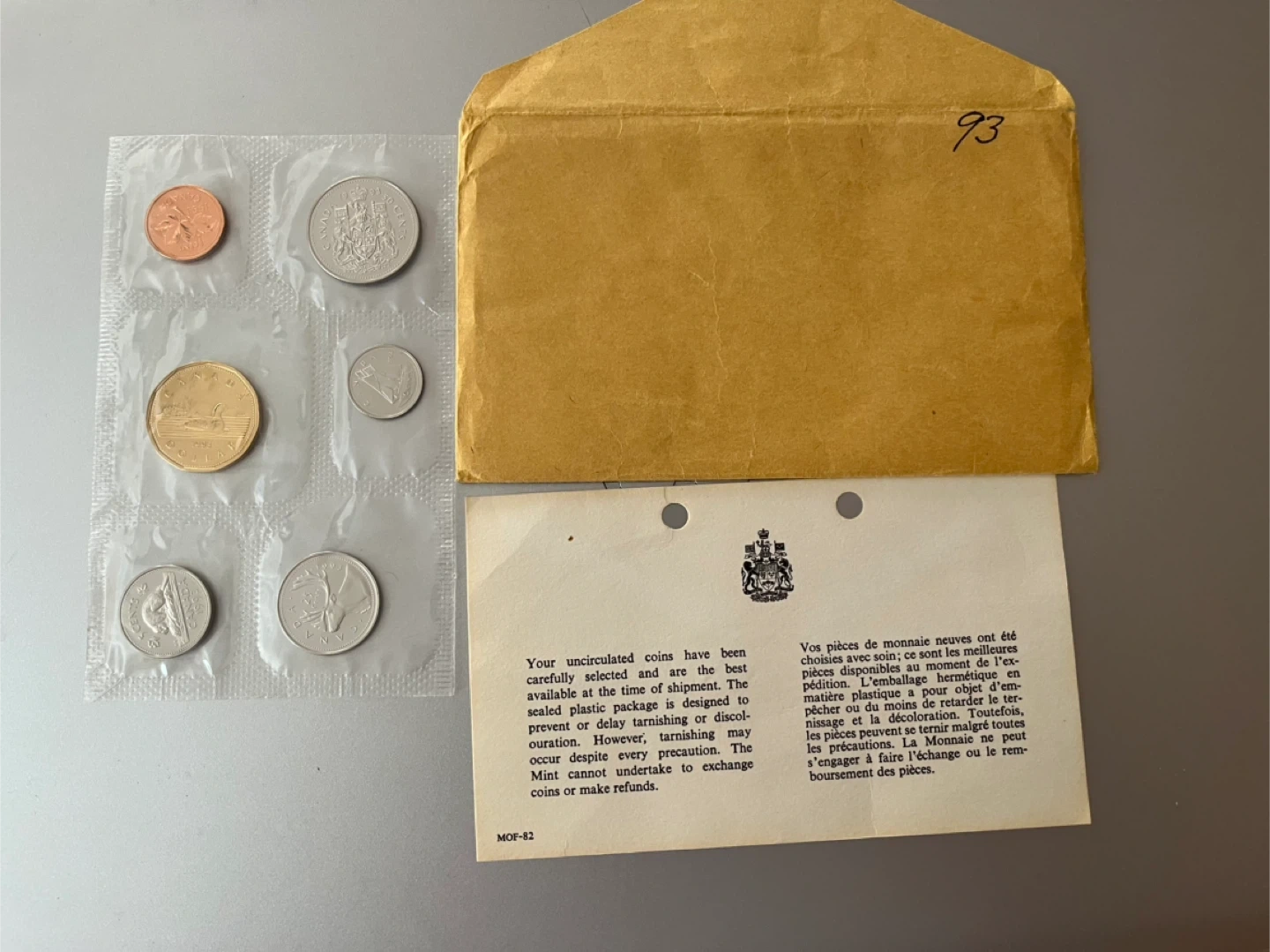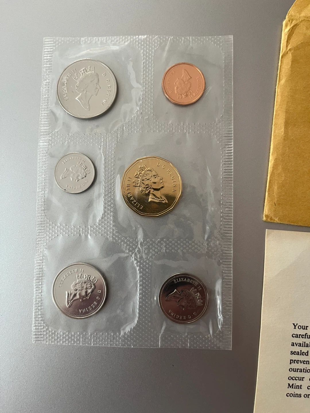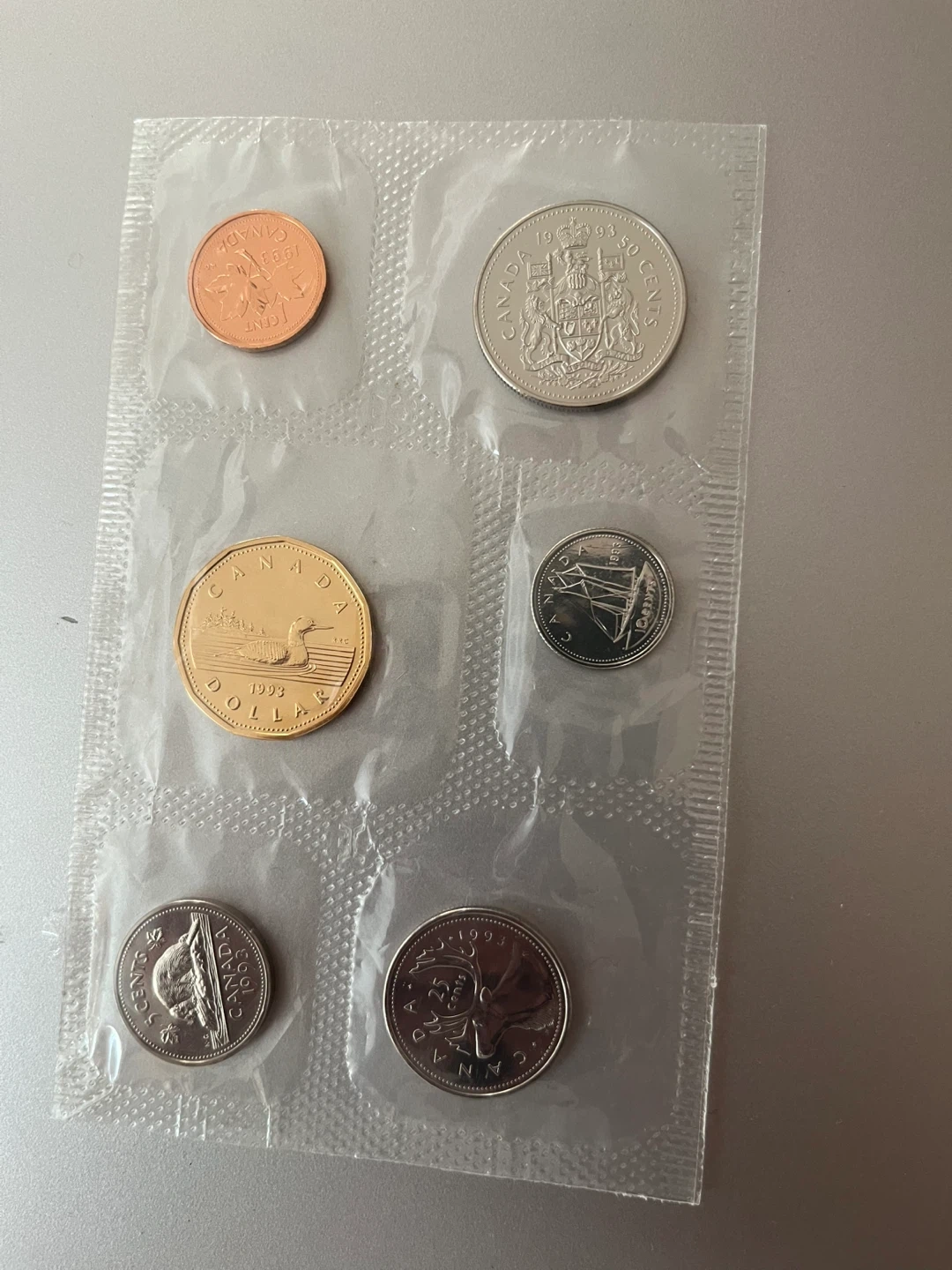 250Selling a 1993 Canadian uncirculated coin set. The coins are sealed in a plastic package, designed to prevent tarnishing or discolouration. It includes all the standard denominations from that year.