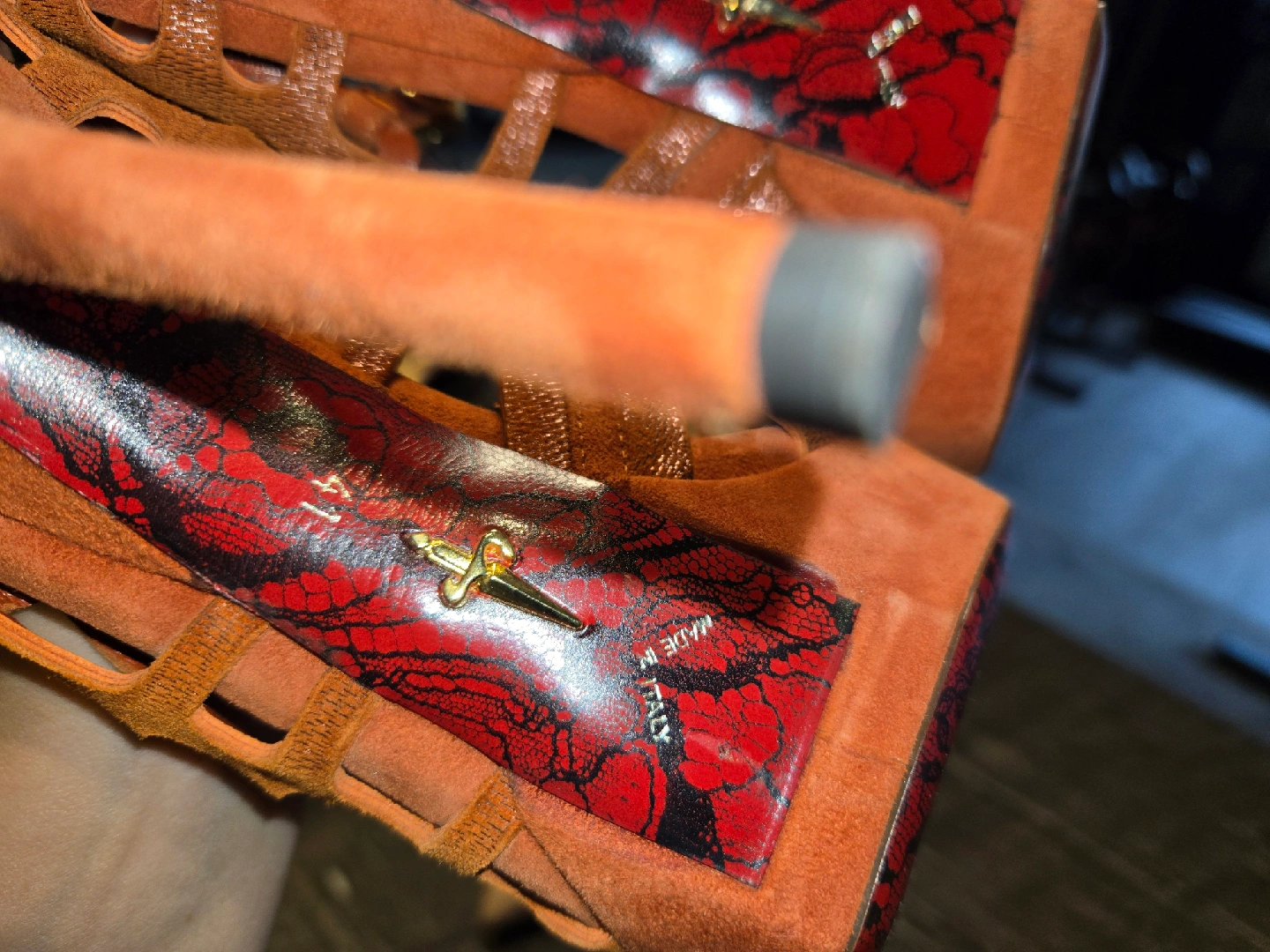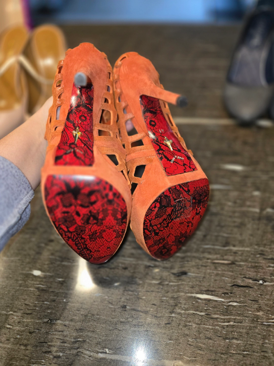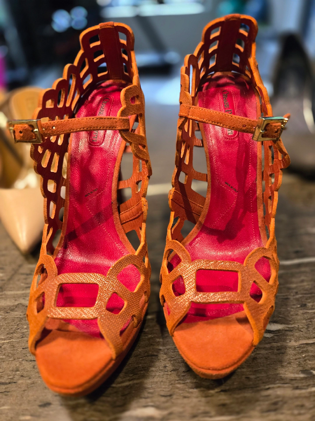 205These Cesare Paciotti heels are a unique addition to any wardrobe! They feature a distinctive cut-out design and a vibrant orange colour. Size 41