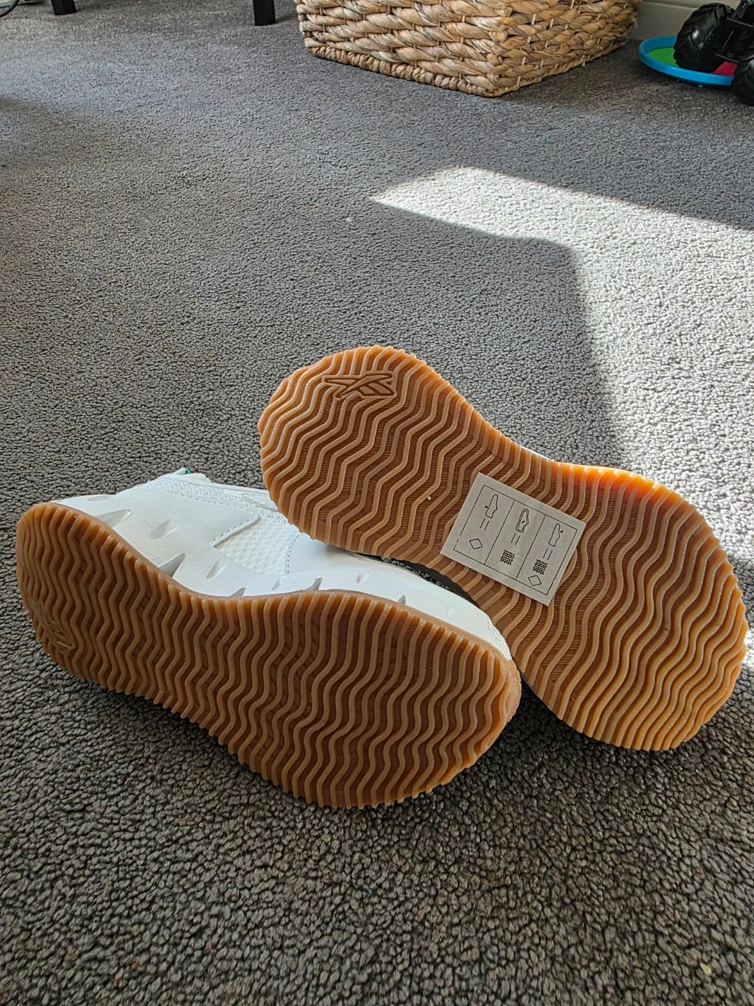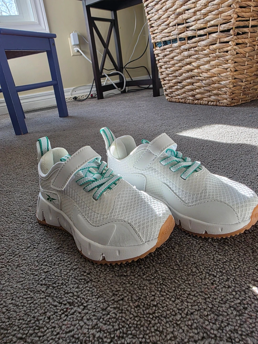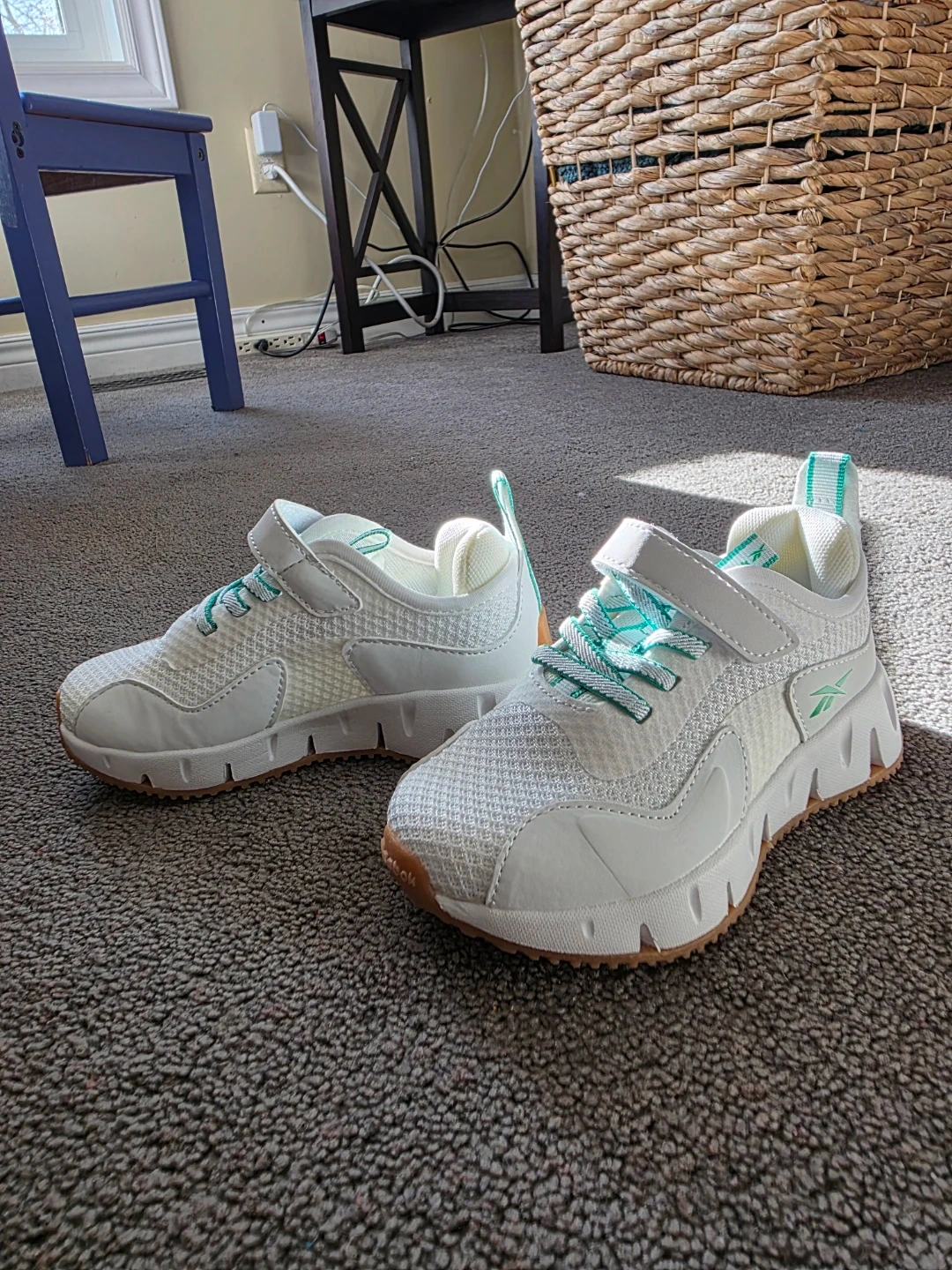These Reebok kids' shoes are white with green accents. They feature a breathable mesh upper and a secure hook-and-loop closure. The durable rubber sole offers good traction.