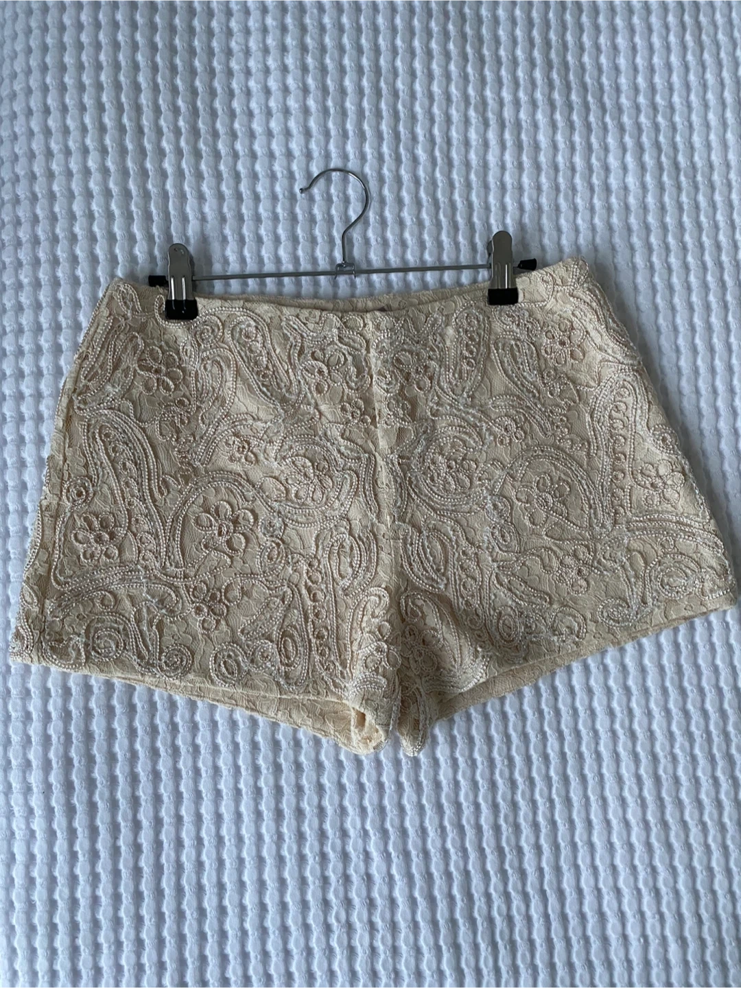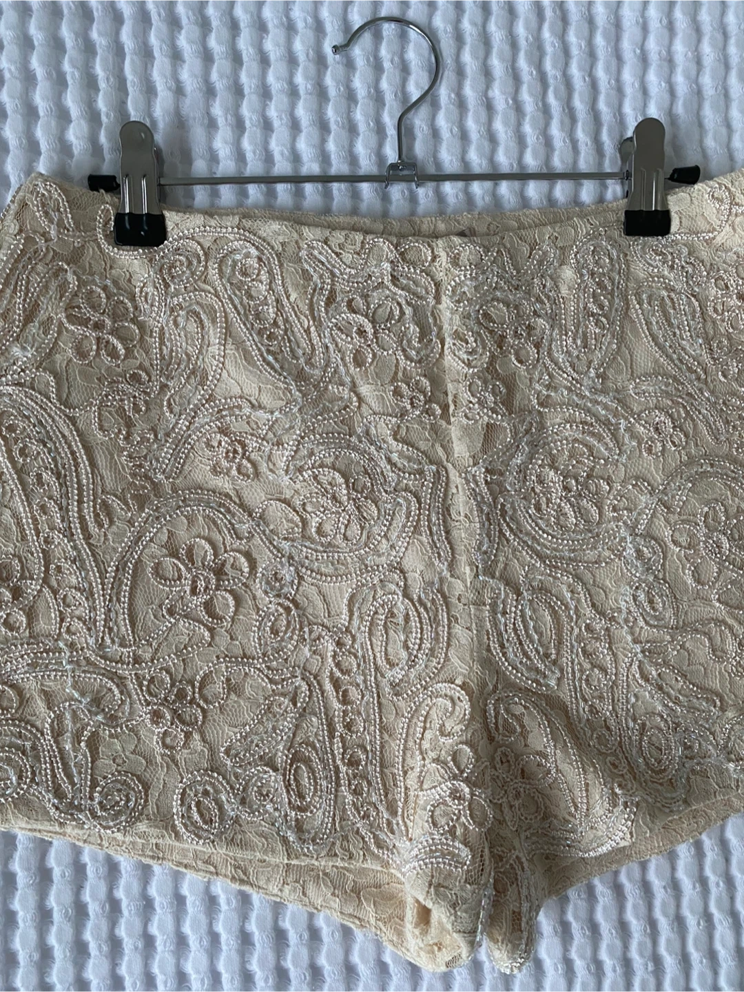These cream-coloured lace shorts feature an intricate paisley-inspired pattern. They're designed with a high waist and a slightly flared leg. These shorts would be lovely for a summer evening out!