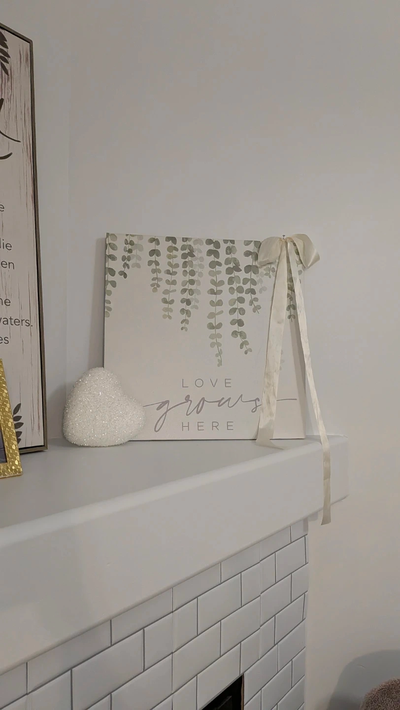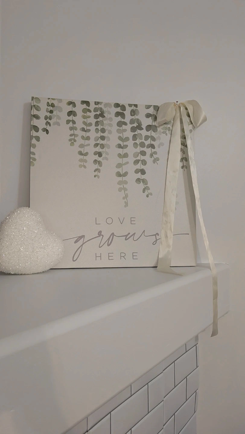 Canvas wall art with the phrase 'LOVE grows HERE' in elegant script. It features a trailing vine design in green and grey tones. A cream-coloured satin ribbon is tied in a bow at the top right corner.