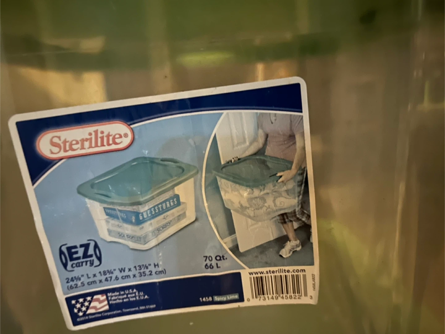 This is a Sterilite storage bin with a 70-quart capacity. It measures 24.6 inches long, 18 inches wide, and 13.75 inches high. The clear plastic bin comes with a lime green lid. It's perfect for organizing your home!