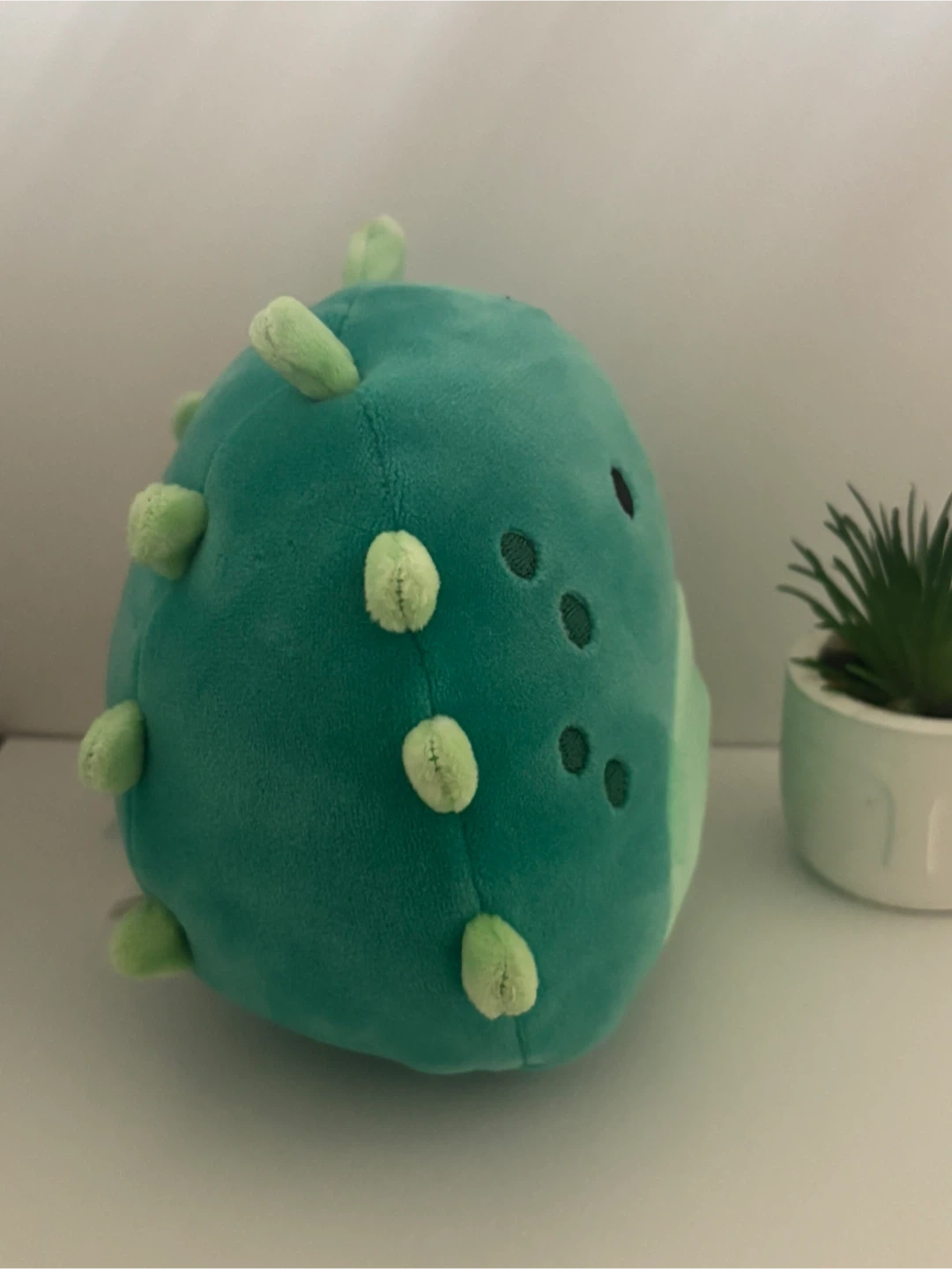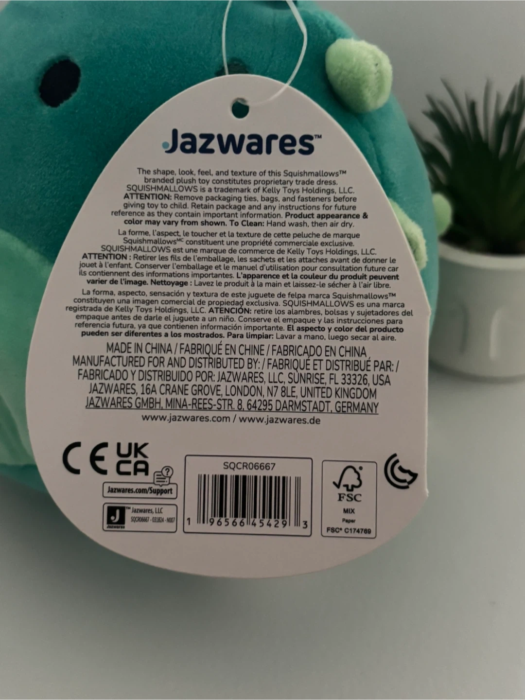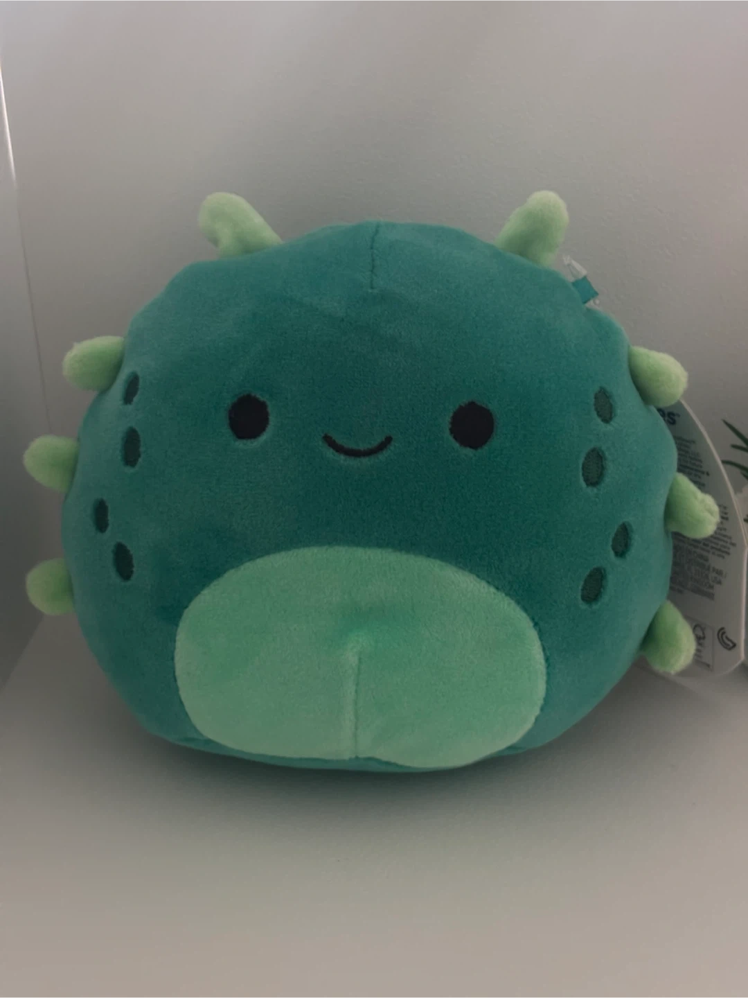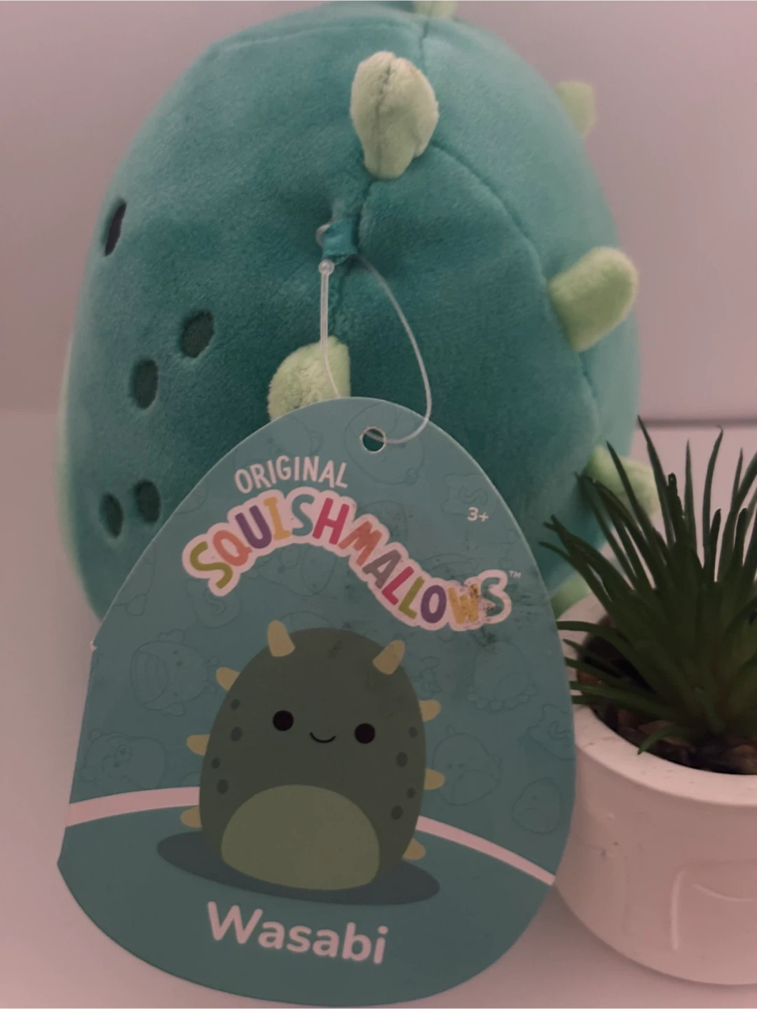 This is a Jazwares Squishmallow named Wasabi. It's a teal plush toy with light green spikes and a round body. This toy is suitable for ages 3 and up. It's made with soft, huggable material.