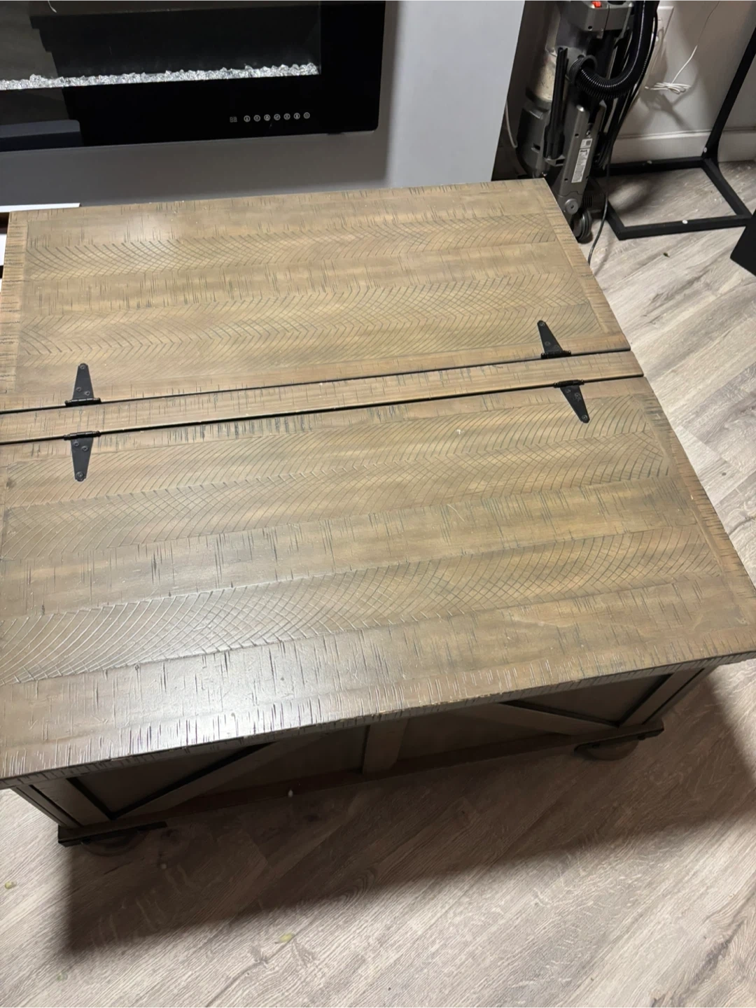 This wooden coffee table offers ample storage space inside. It's great for keeping your living room tidy. The hinged lid provides easy access to the storage compartment. Its rustic design fits well with various decor styles.