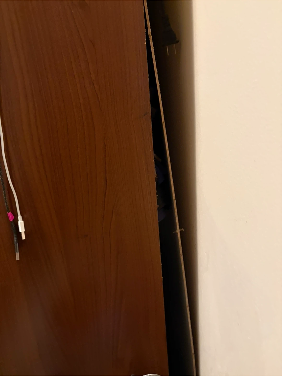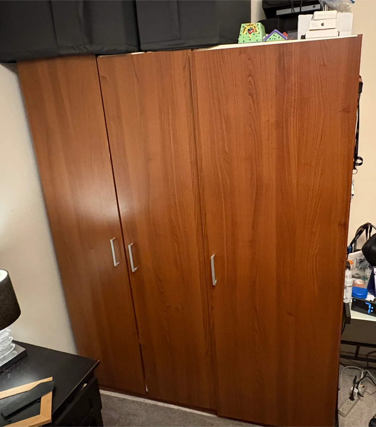 This is a three-door wardrobe with a cherry wood finish. It has a hanging rod for clothes and multiple shelves for storage. The doors have simple silver handles. Some minor wear is visible on the back panel which could be nailed back together.