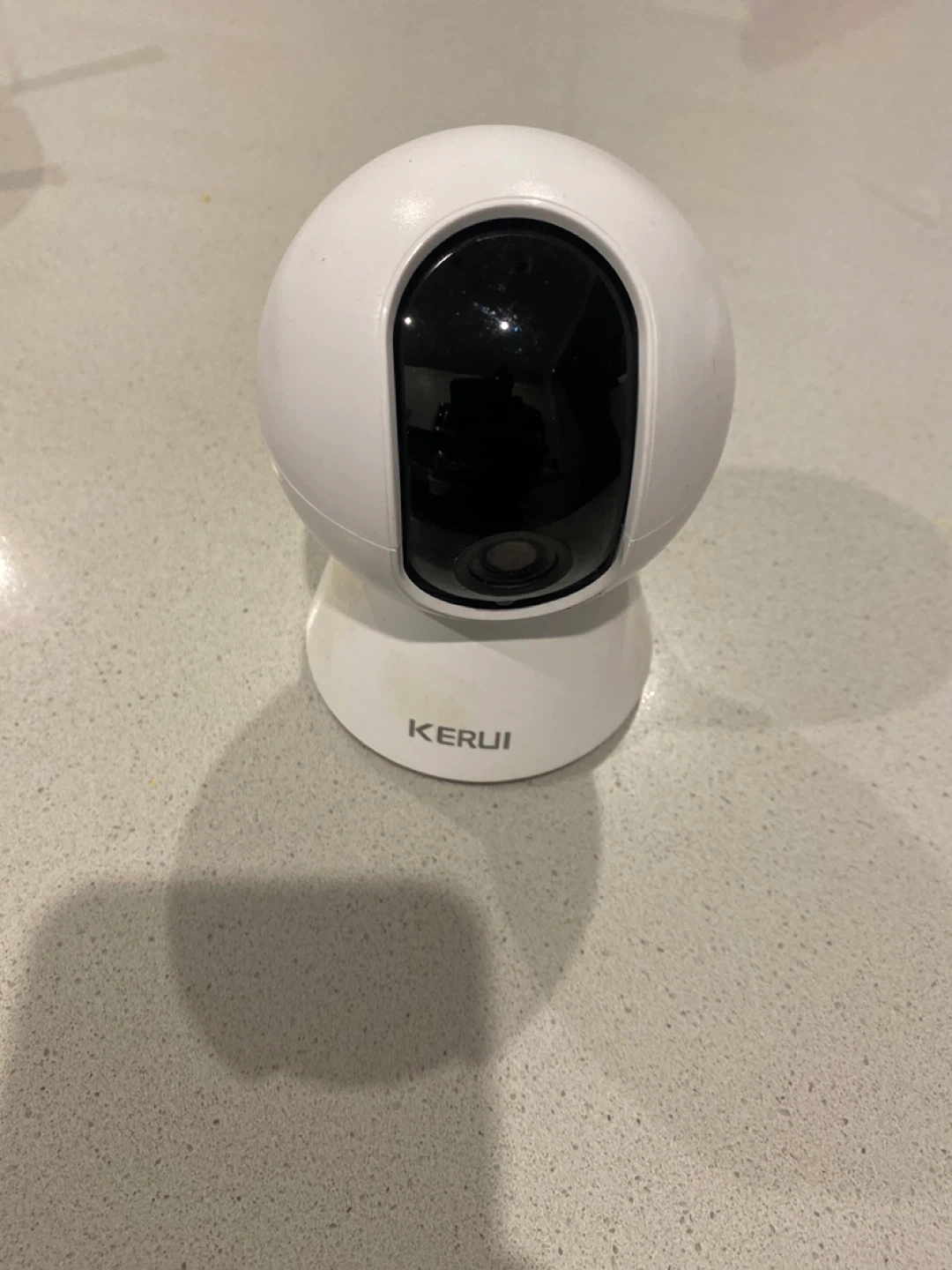 Kerui pan-tilt security camera in white. This camera offers remote viewing and movement control. It's useful for monitoring your home or pets when you're away.
