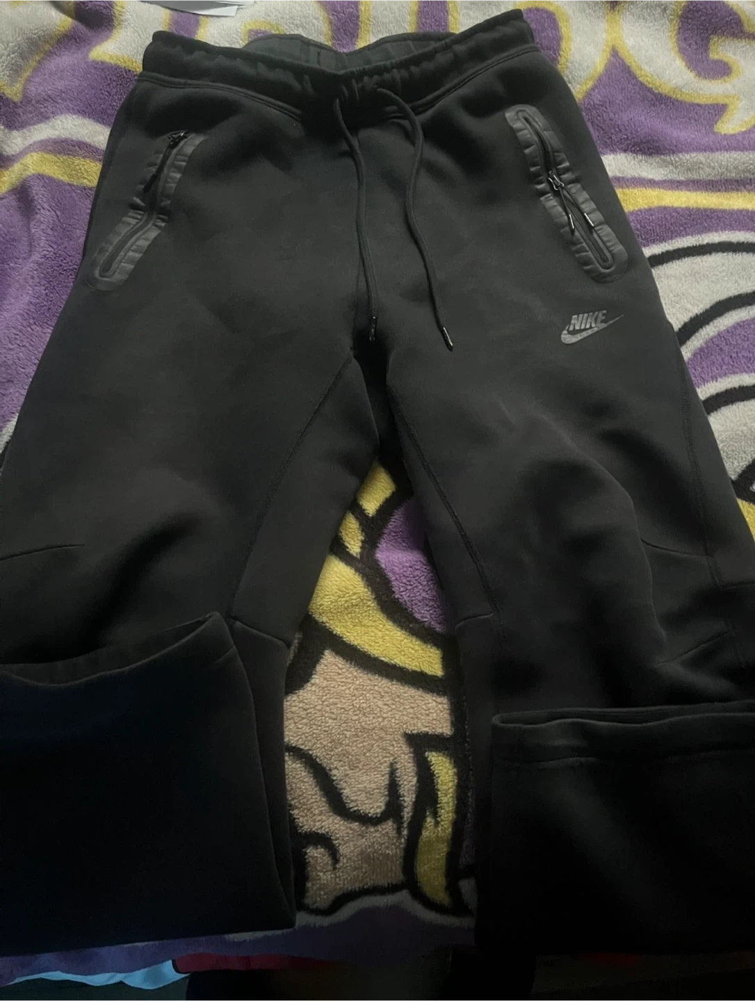 Black Nike Tech Fleece full zip hoodie with a hood and zippered pockets. Matching black Tech Fleece joggers with zippered pockets. Comfortable set for everyday wear.