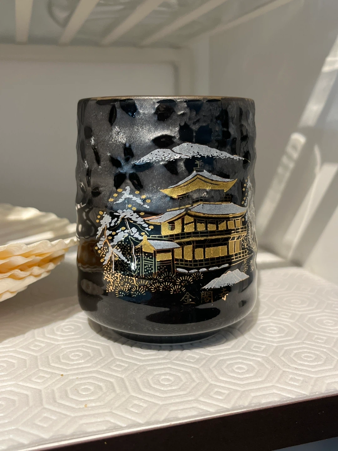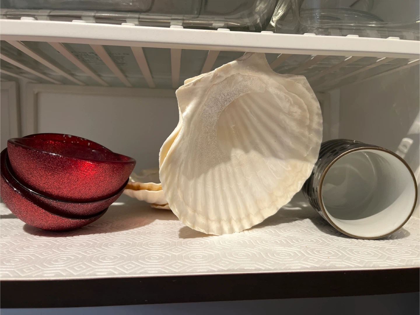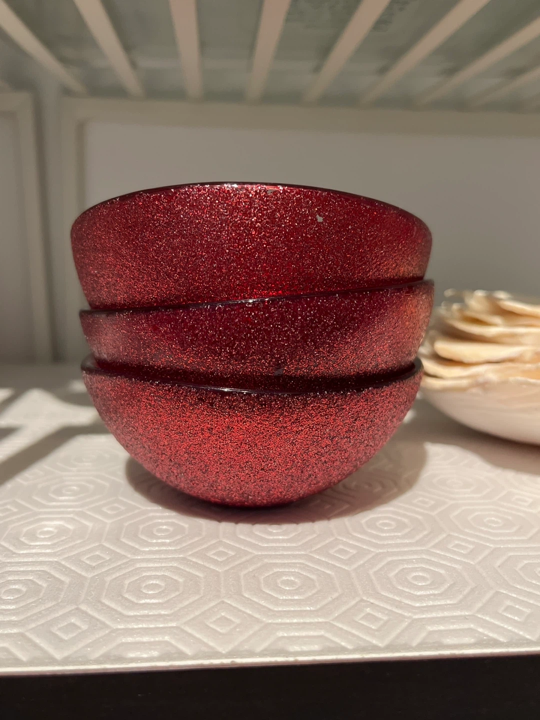 Three sparkly red berry bowls stacked together, perfect for snacks or decoration. Also includes a black decorative tea cup with a gold pagoda design.