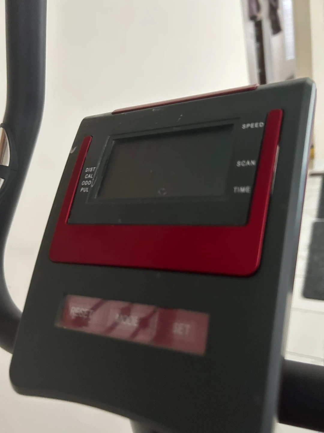 This is a red and black exercise bike. It has a digital display showing speed, distance, time, and pulse. It also features adjustable resistance for a customized workout.