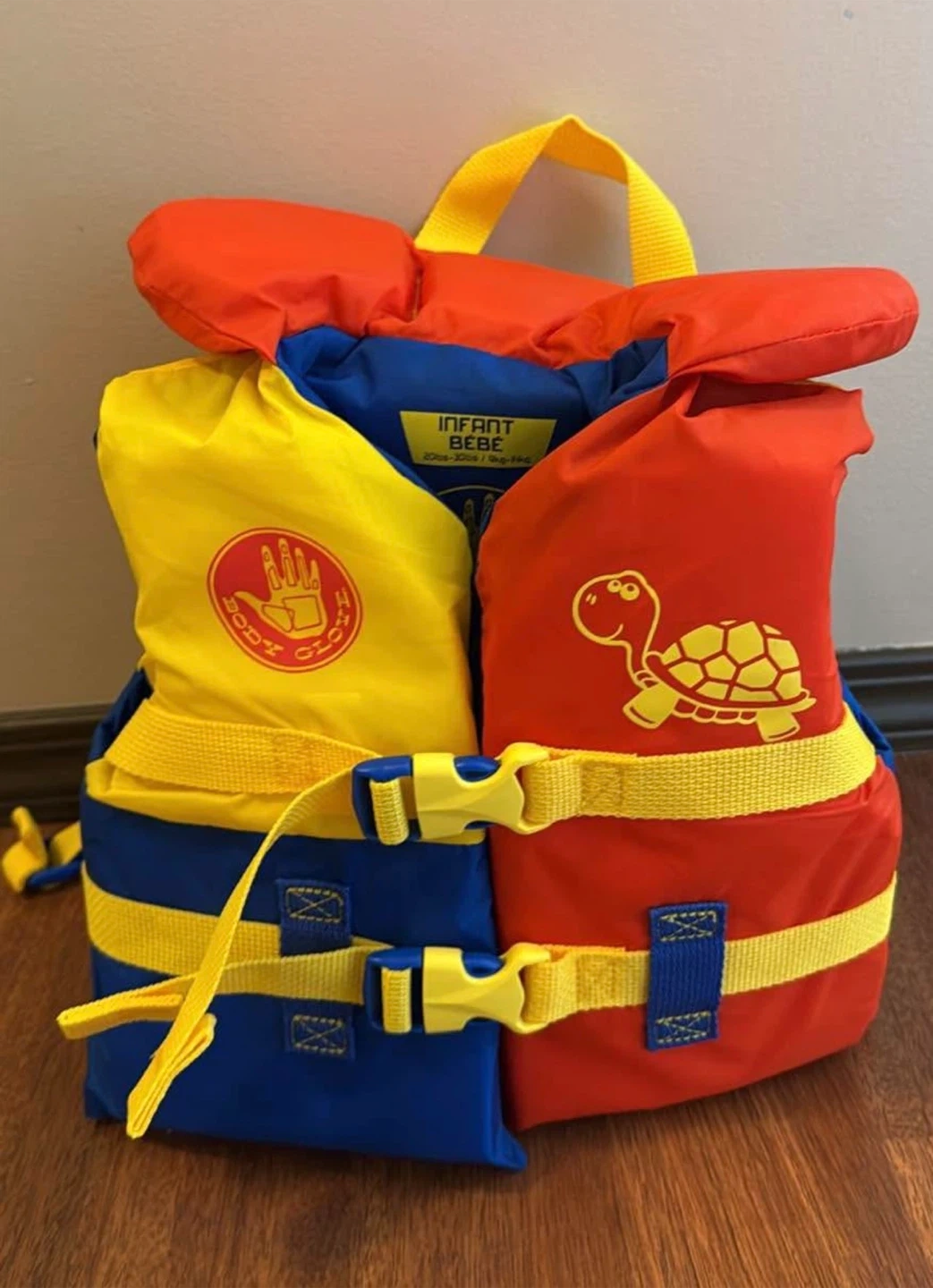 This is a Body Glove infant life vest for babies weighing 20-30 lbs. It has a bright blue, yellow, and red design with a cute turtle graphic. Buckles and straps ensure a secure fit for safety.
