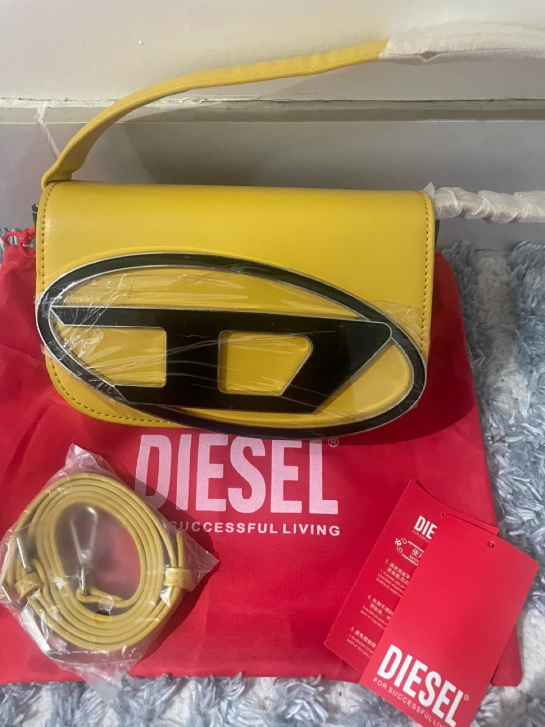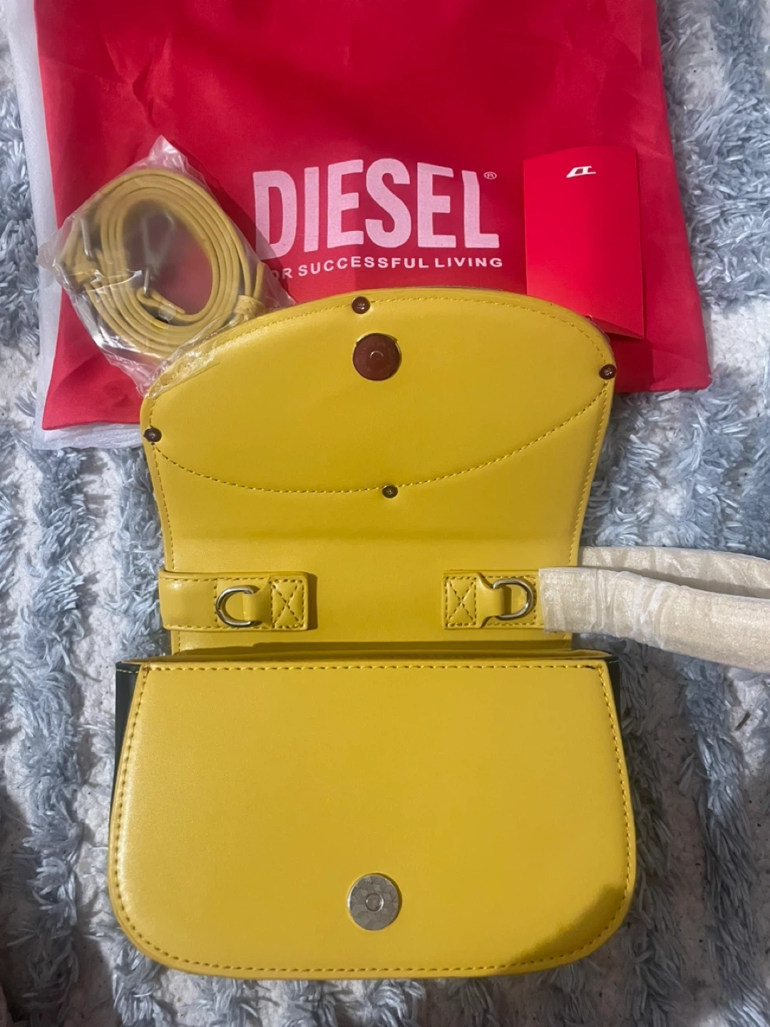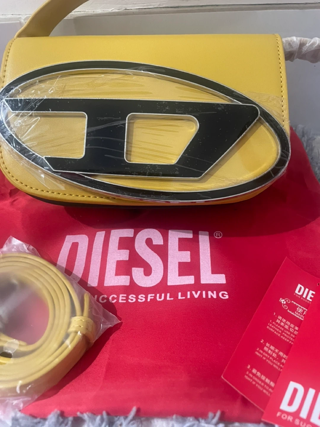 Stylish yellow Diesel shoulder bag featuring the prominent D logo. It's made of leather and comes with a detachable strap and dust bag. Perfect for adding a pop of colour to any outfit!