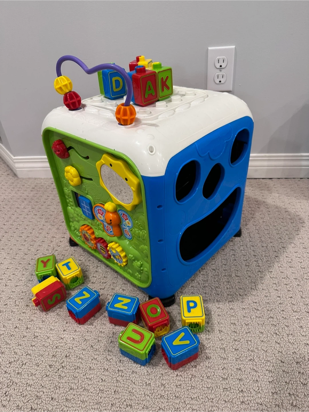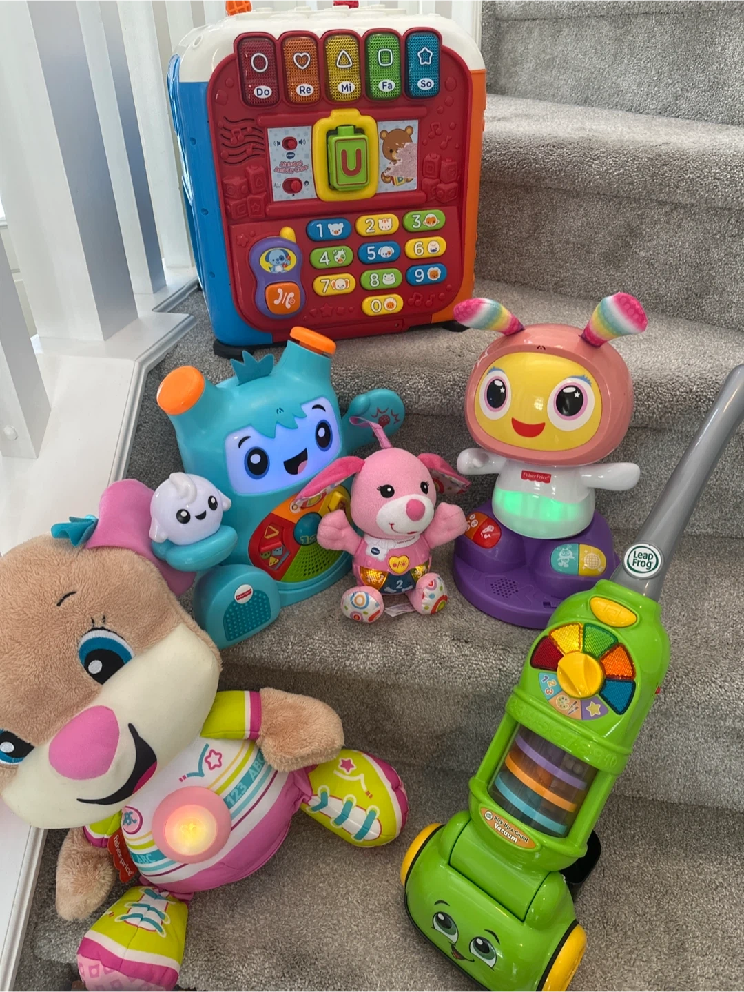 Bundle of learning toys including a Fisher-Price Laugh & Learn Puppy, a V-teck alphabet activity cube, a Fisher-Price dance and groove Rock it Bilingual toy, a Fisher Price Beatbo robot, a LeapFrog vacuum toy, a V-teck cuddle and sing puppy, a Mastermind 33 piece Wooden block set and assorted puzzles (all working-batteries included). Pet-free and smoke free house. Cash transactions only please! Thank you