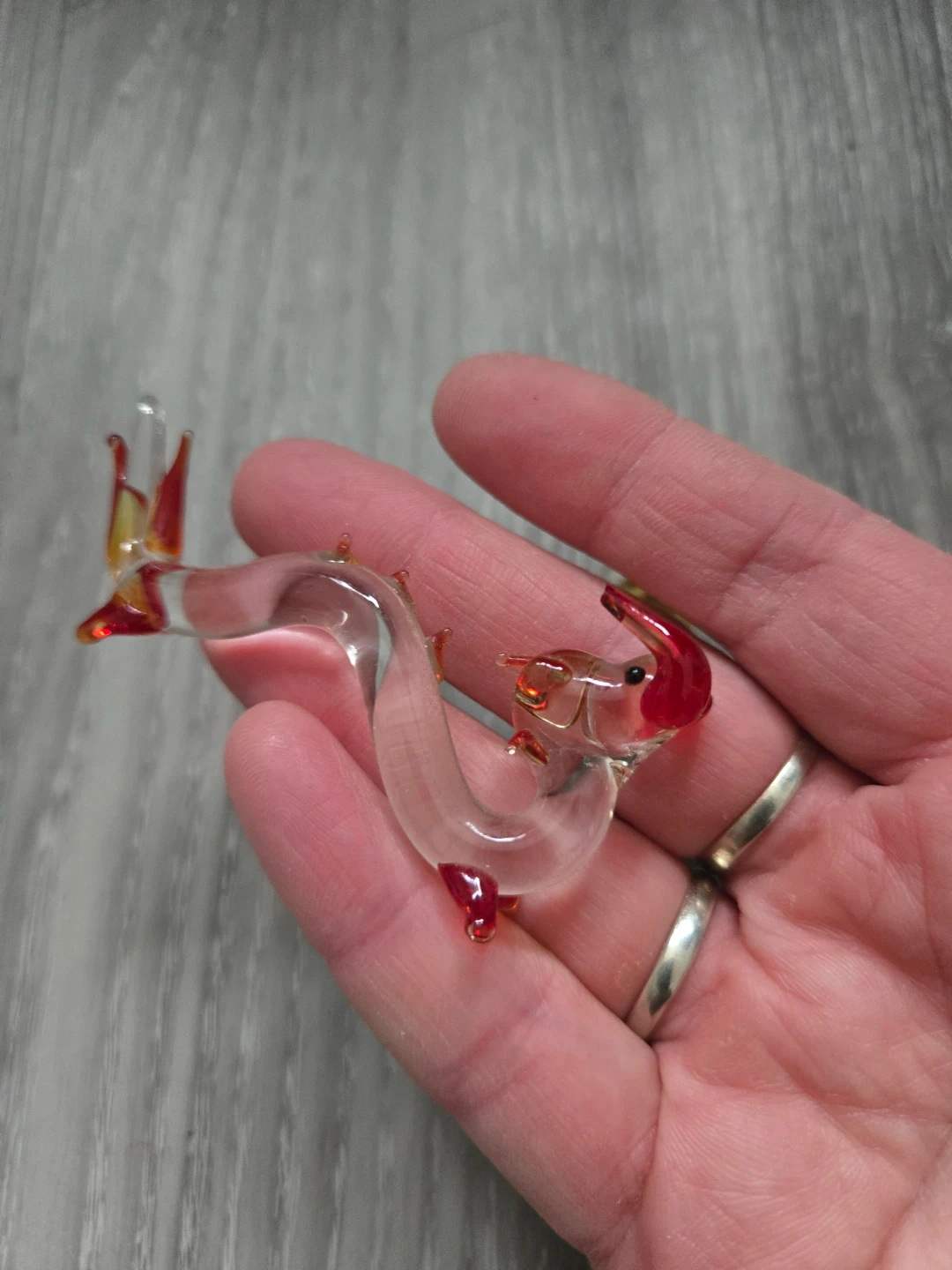 Two tiny decorative glass animal figurines. One is a yellow bunny with black eyes and a white belly. The other is a clear glass dragon with red accents on its head and tail. These are delicate, handmade glass pieces.