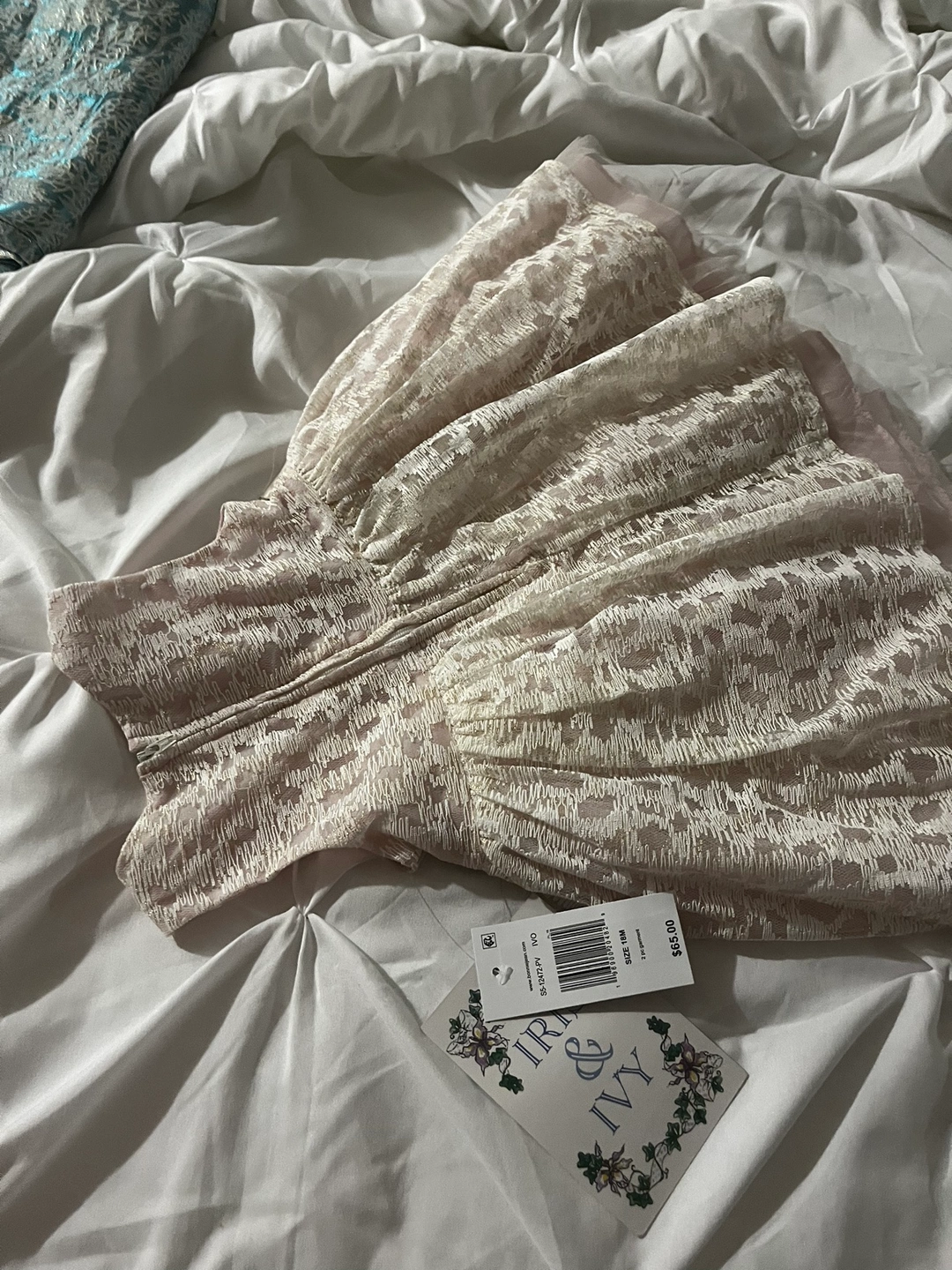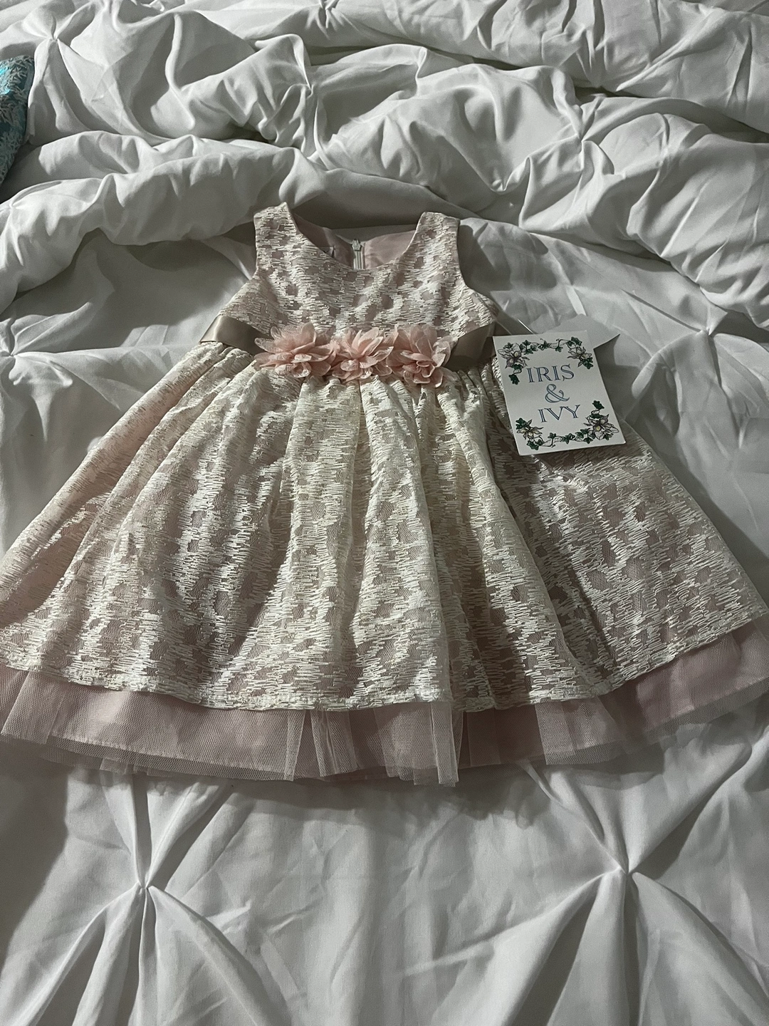 A cute and elegant dress with a pink and white floral design, perfect for a special occasion. It features a tulle skirt with a satin belt and flower accents. The dress has a zipper closure at the back and is fully lined.