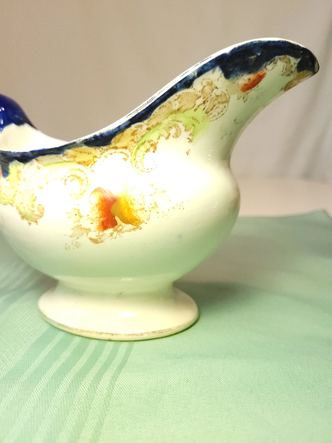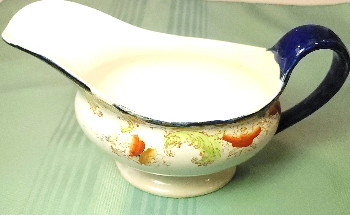 This is an exquisite antique gravy boat by W.H. Grindley & Co. in the highly collectible "Lorne" pattern. Registered in 1898, this piece is a stunning example of late Victorian "clobbered" ware—featuring deep cobalt flow blue transferware accented by hand-painted orange floral motifs and delicate gold gilt highlights along the scalloped rim and handle.