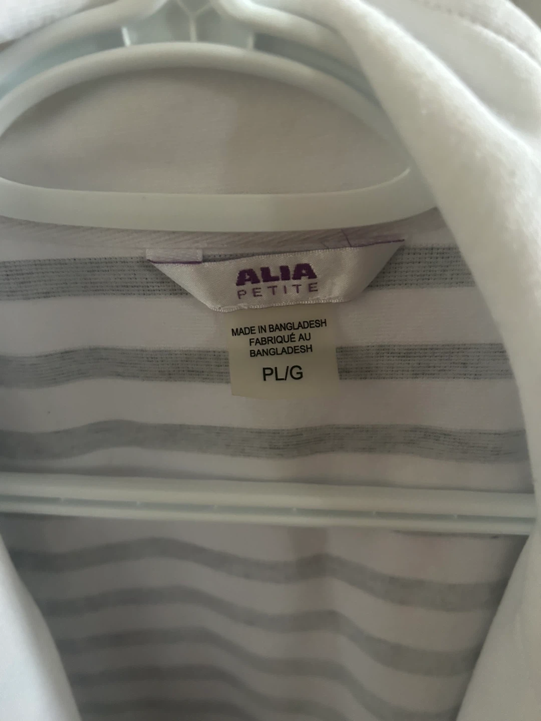This ALIA PETITE jacket is designed with a classic black and white stripe pattern. It's a zip-up style with a white collar and cuffs.