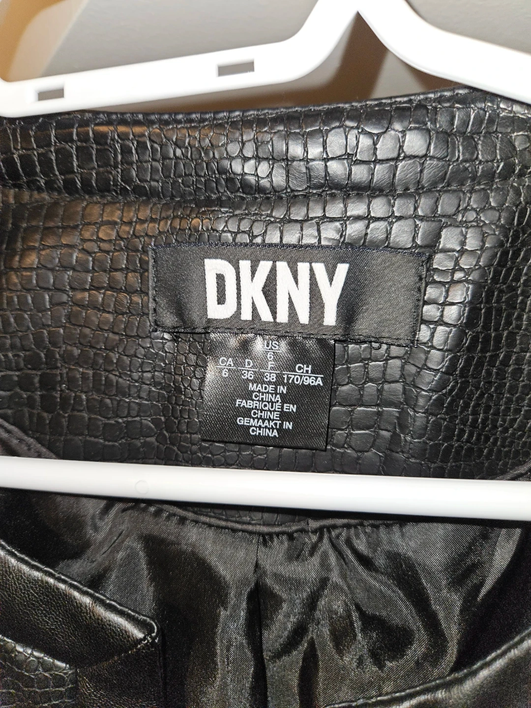 This DKNY cropped jacket features a black faux leather material with an embossed texture. It has a smooth lining and two front flap pockets.
