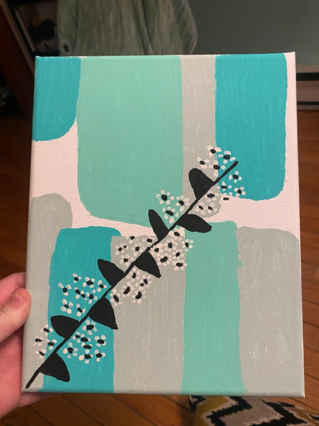 Canvas painting featuring a black branch with white and black blossoms on a background of teal and grey abstract shapes. Artwork measures 8x10 inches. Acrylic paint on canvas.