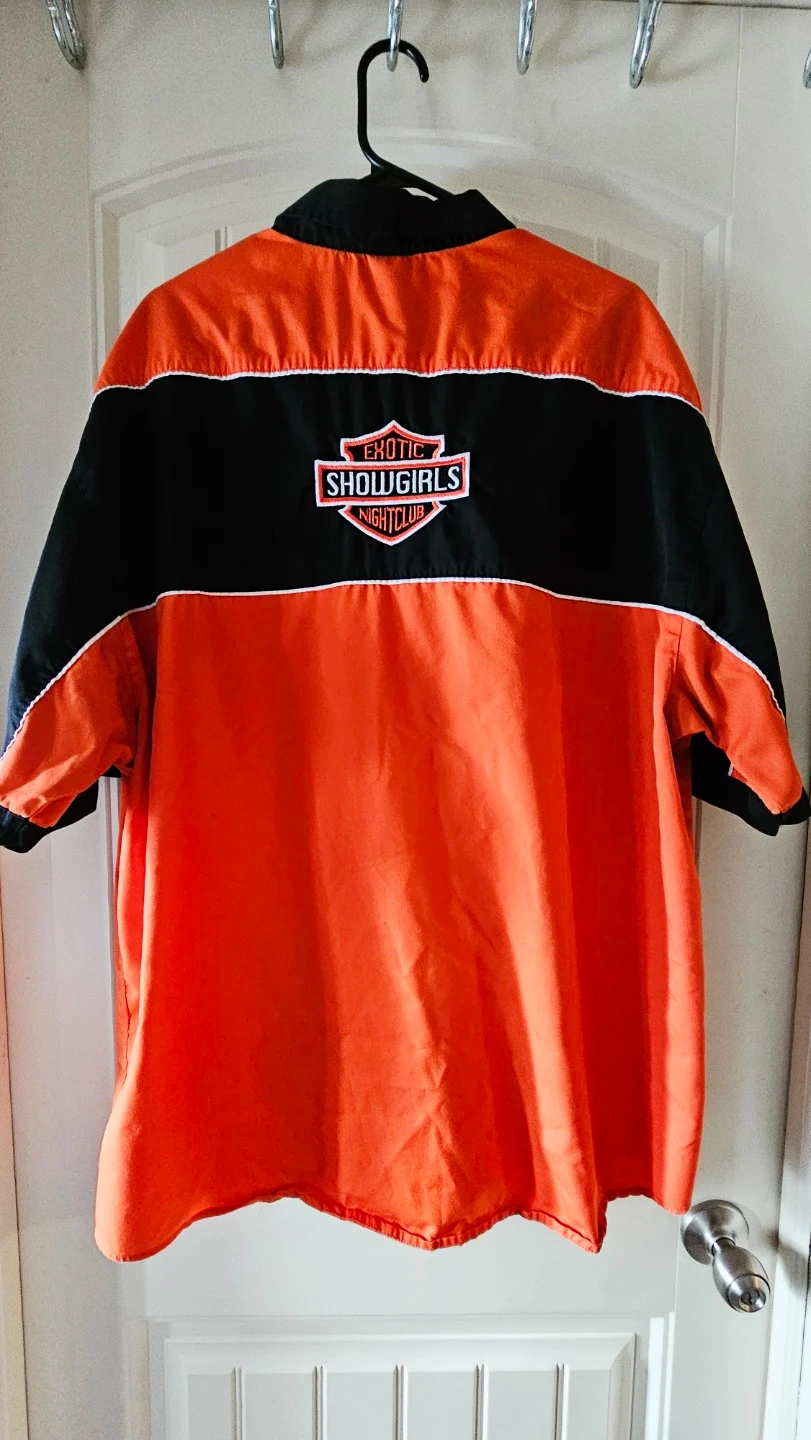 Harley Davidson branded short sleeve button-up shirt featuring "Exotic Showgirls Nightclub" on the back. Orange, black, and white colourway. Button front closure with a chest pocket on the left side. A great shirt for any Harley enthusiast or for a themed event!