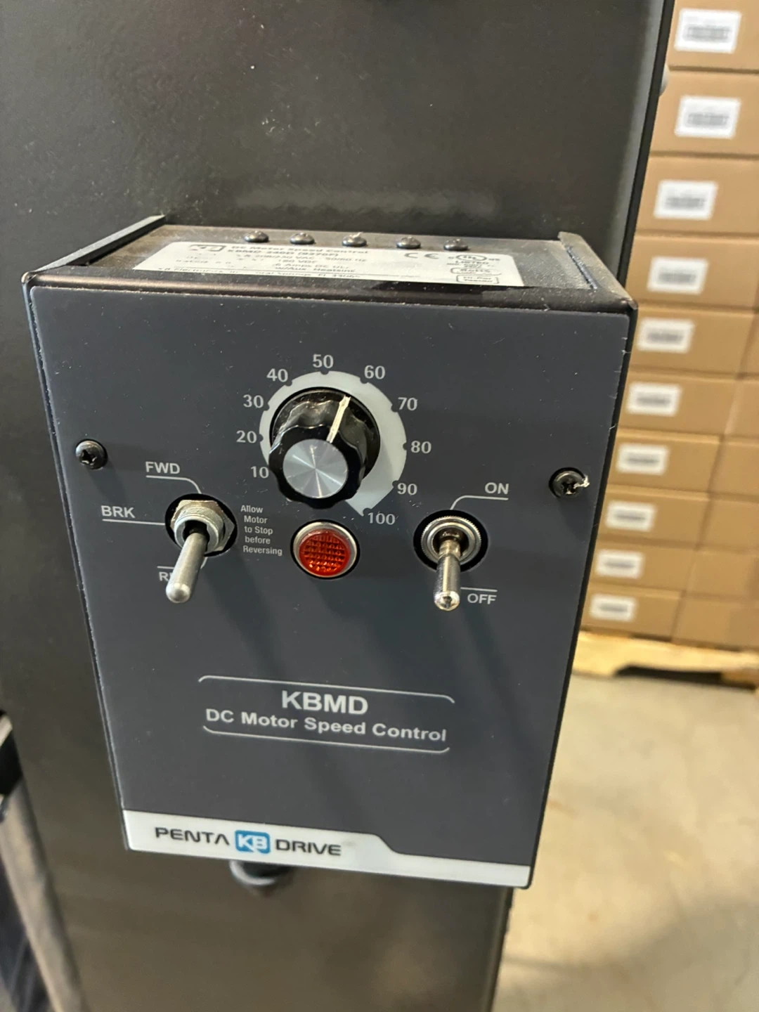 This is a Mach 1 Packaging Systems stretch wrap machine. It's designed for industrial packaging needs. The machine features a powered turntable and a film carriage for efficient wrapping. It includes a DC motor speed control.
