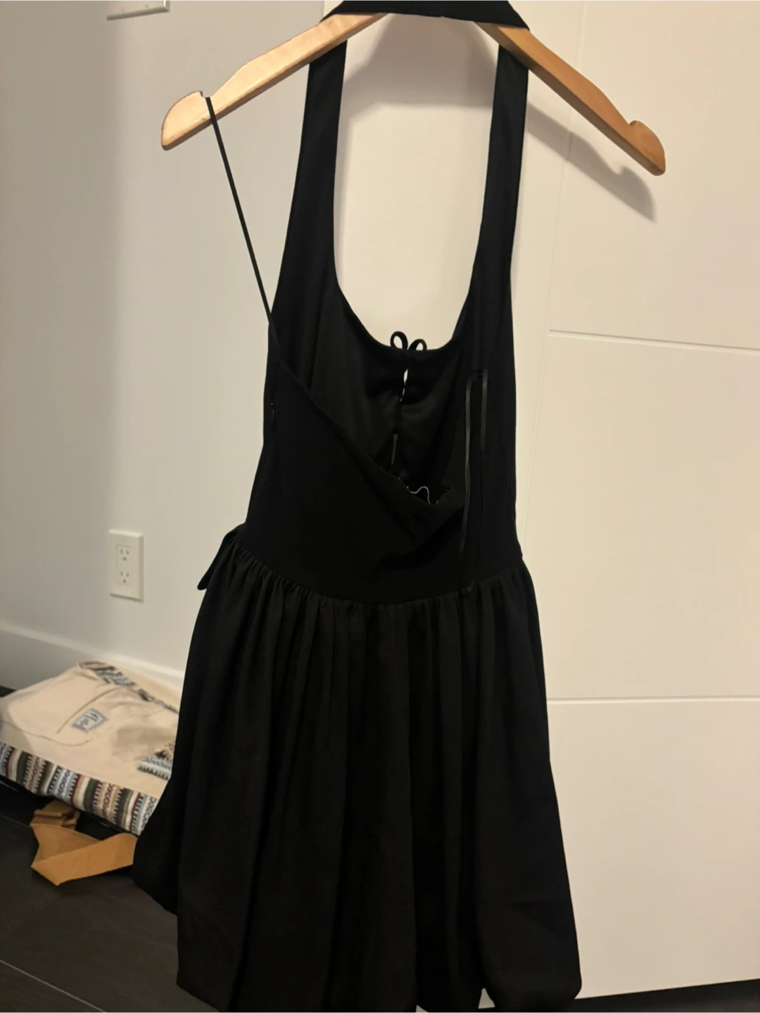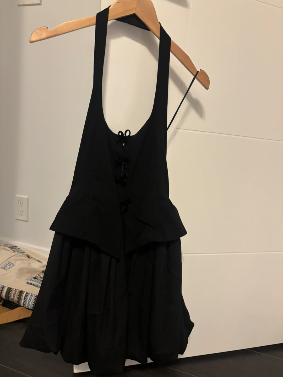 This is a black halter neck mini dress from Zara. It's a size small and features a gathered skirt and decorative buttons on the bodice. Perfect for a night out!