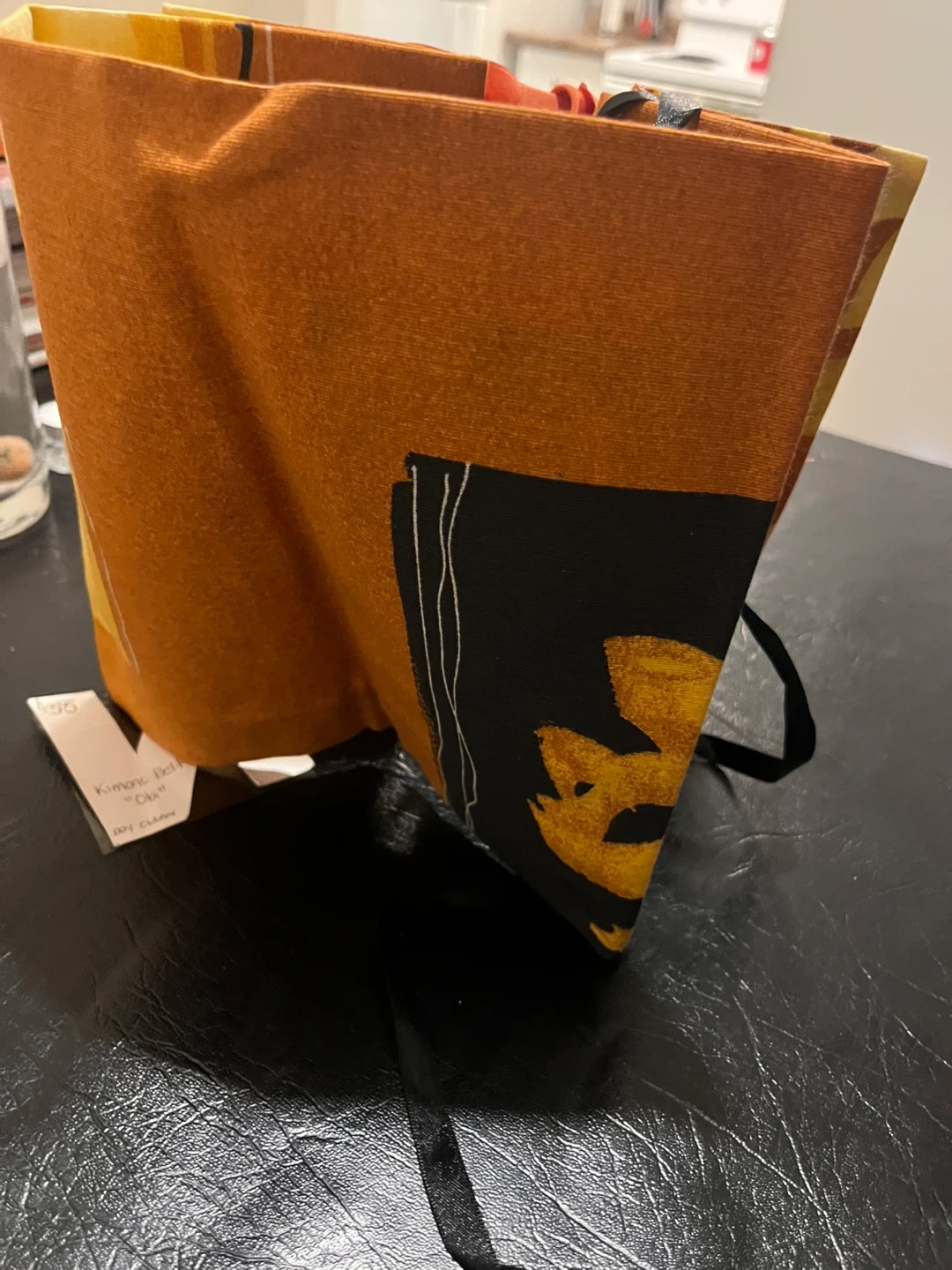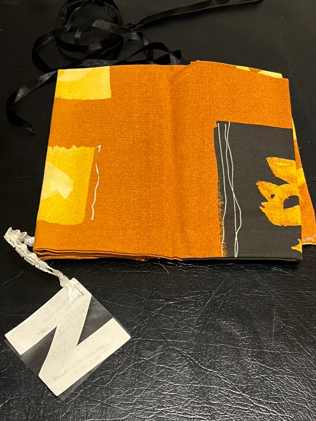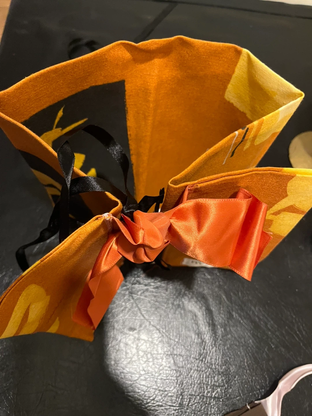 This is a NYZ Kimono Belt "Obi". It's orange with black accents and features a black lace-up corset style front with an orange satin bow. The belt is made of fabric. Perfect for adding a unique touch to an outfit!