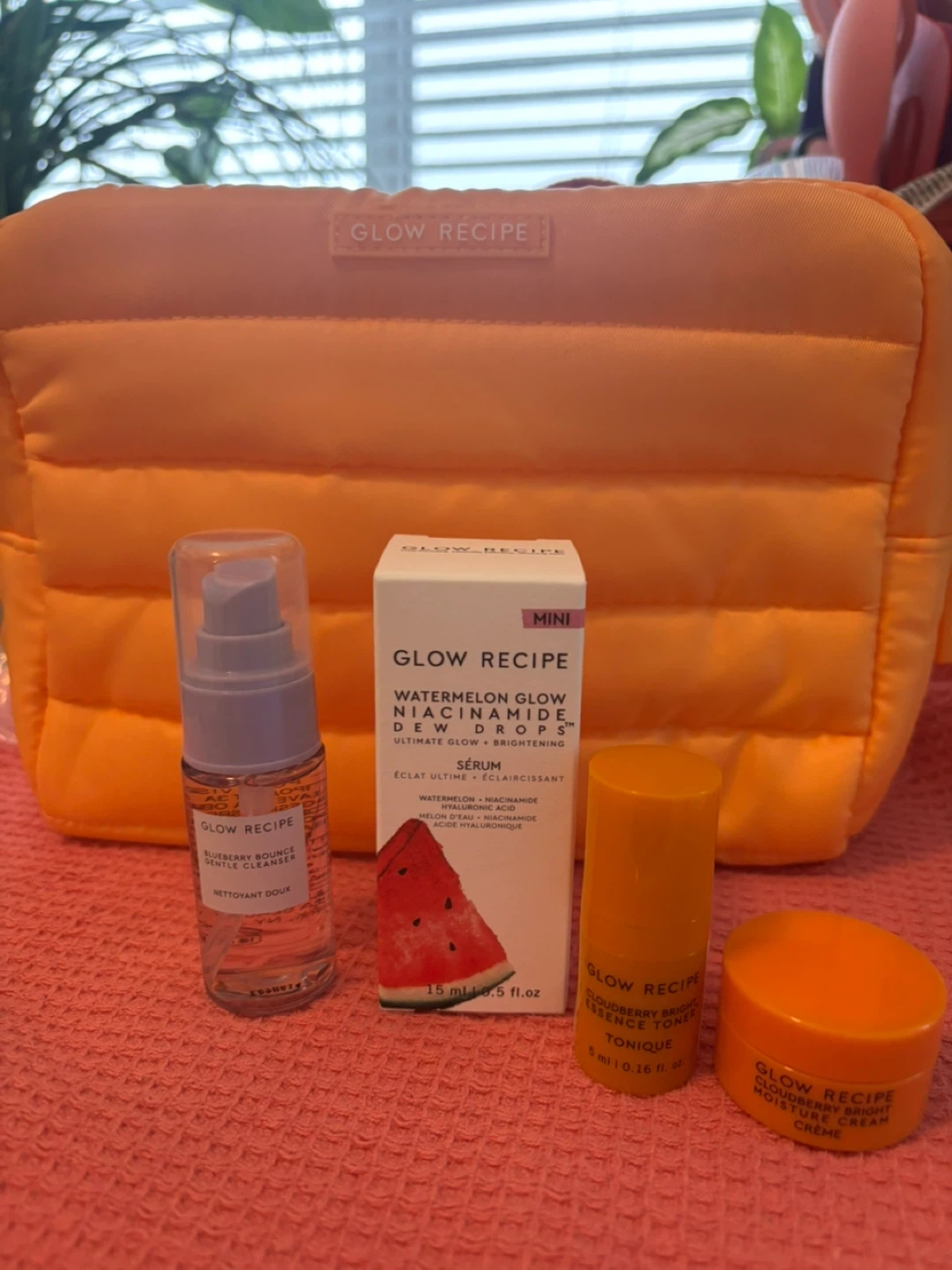 Orange Glow Recipe puffer travel bag. Includes mini Watermelon Glow Niacinamide Dew Drops, Blueberry Bounce Gentle Cleanser, and Cloudberry Biotic Essence Toner. Perfect for on-the-go skincare!