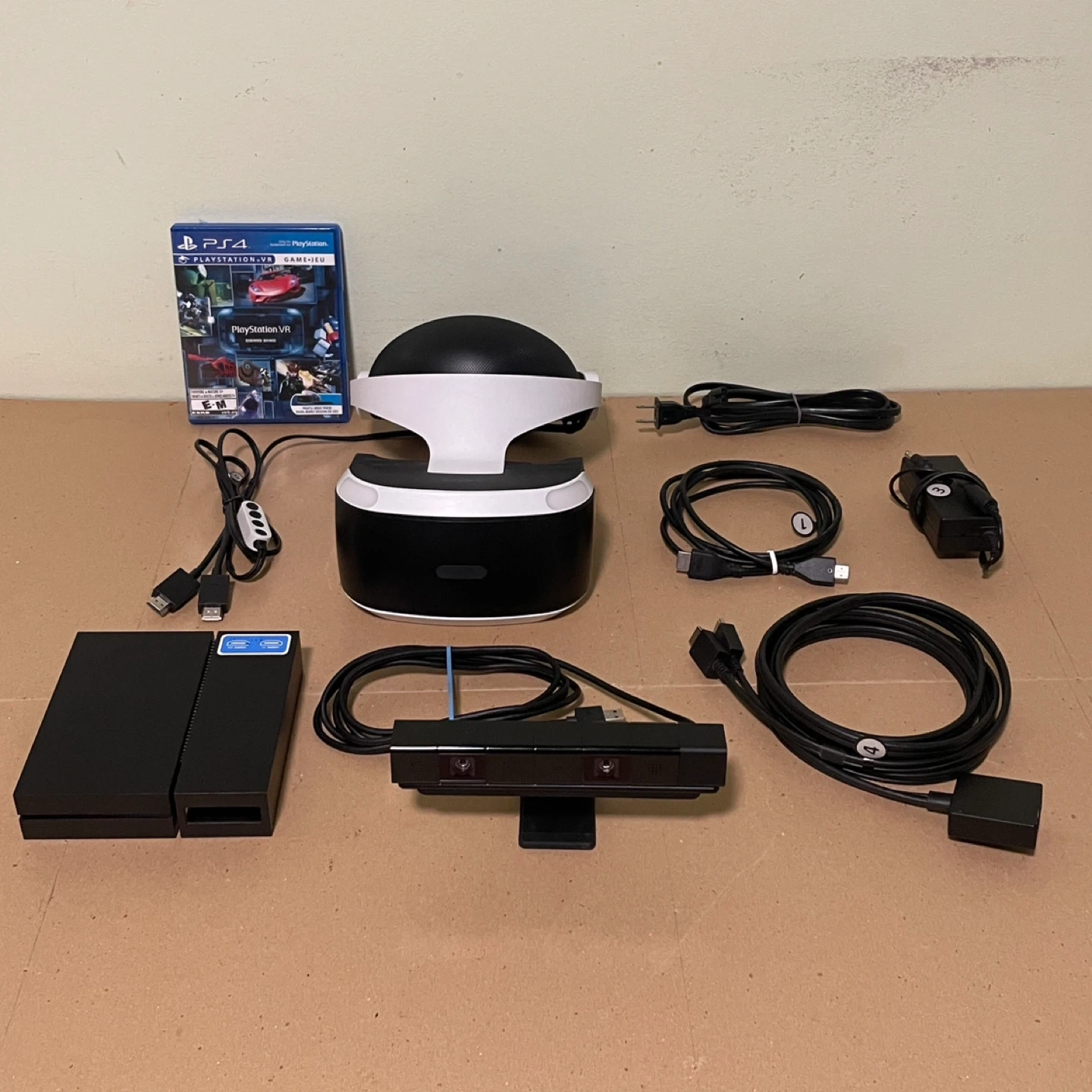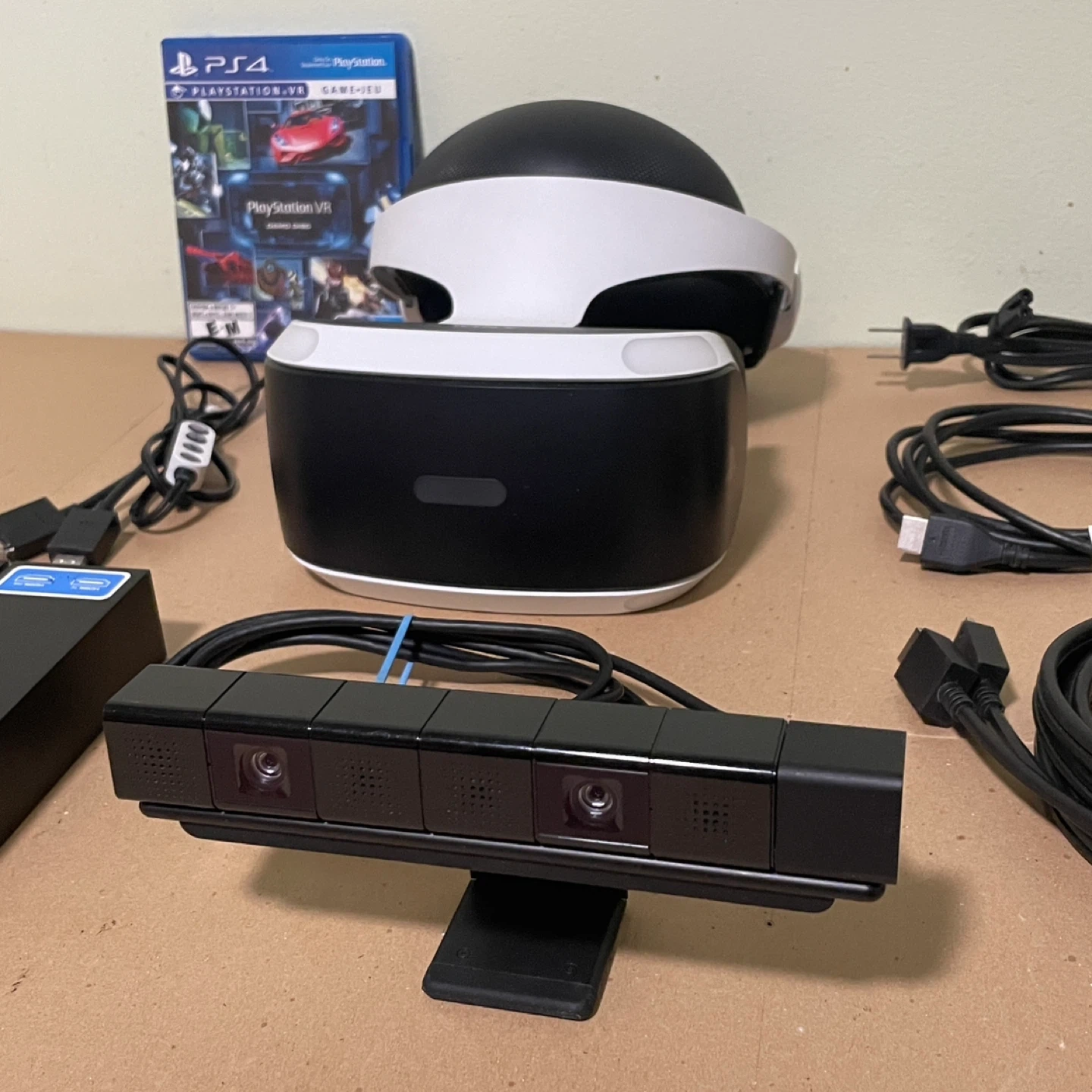 PlayStation VR Virtual Reality gaming headset bundle for PlayStation 4 includes everything except the move controllers. Some games do not require the motion controllers. It is in excellent condition and includes a game demo disc.