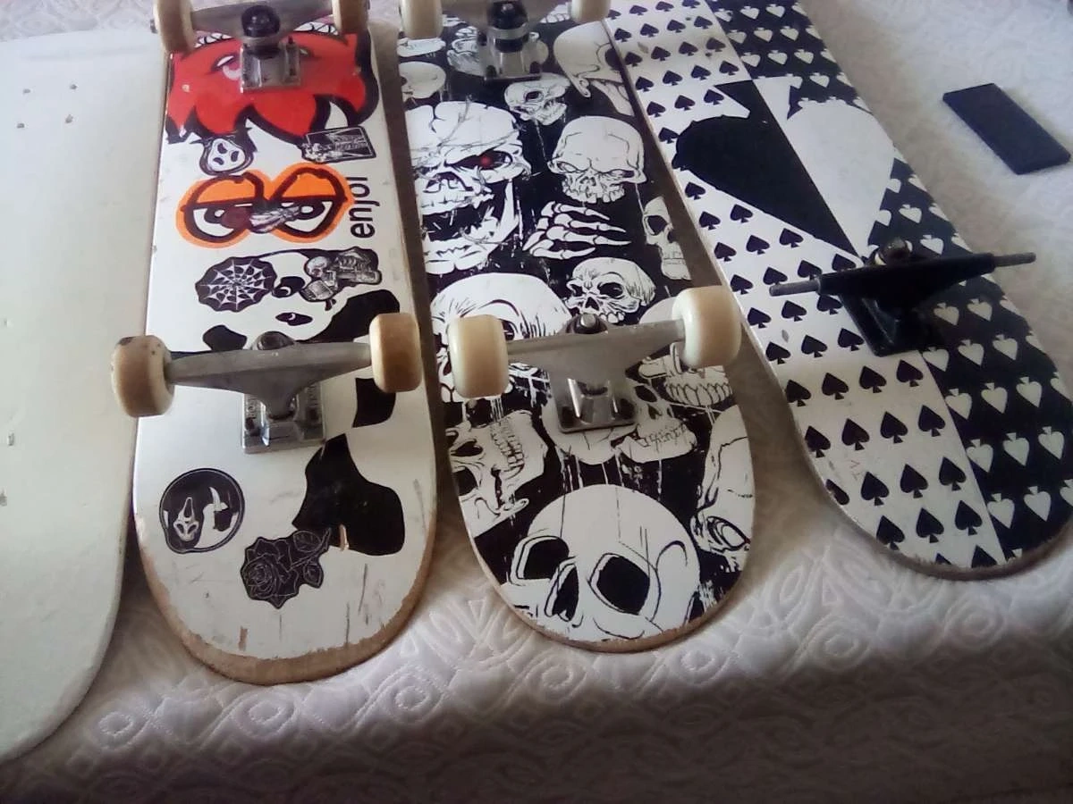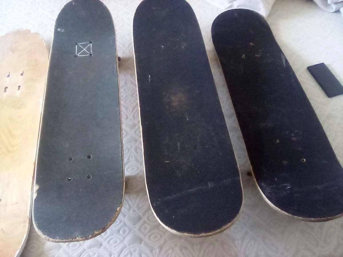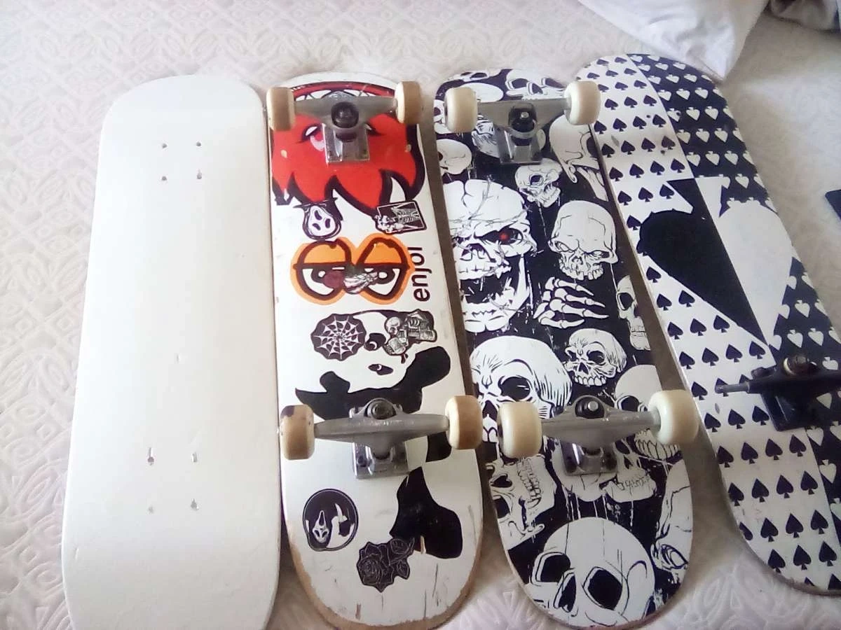 Four skateboard decks are up for grabs. Includes blank decks and decks with graphics. Some decks show signs of wear. Great for customization or replacement parts!