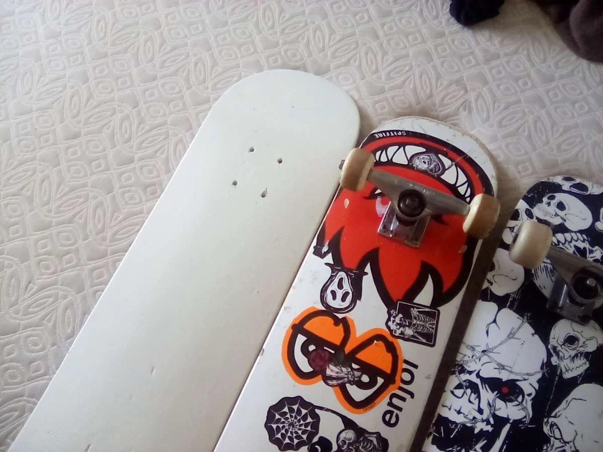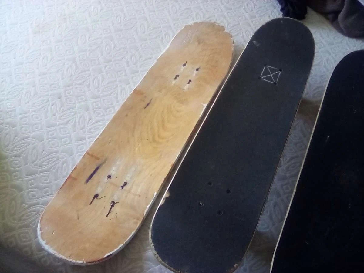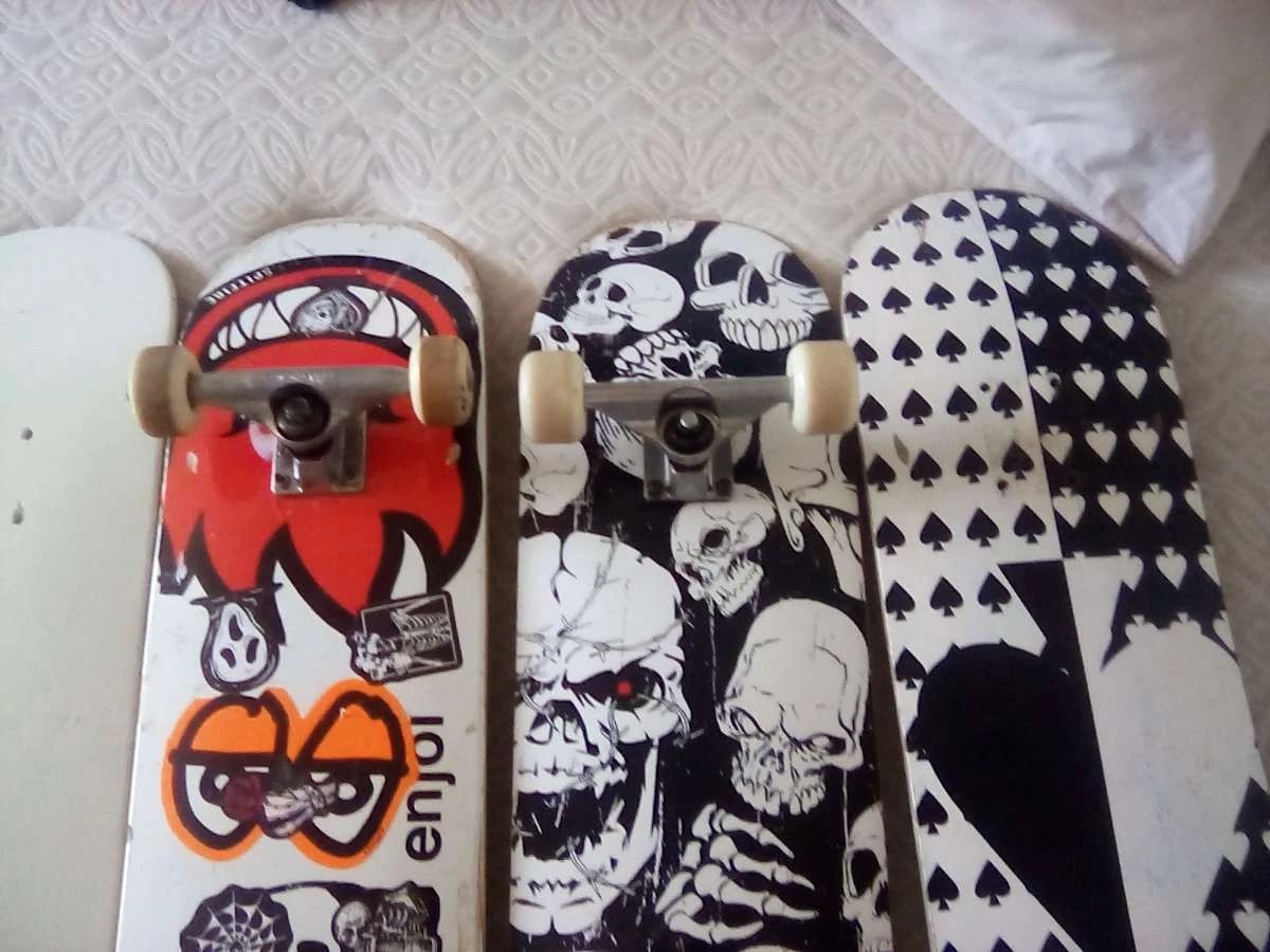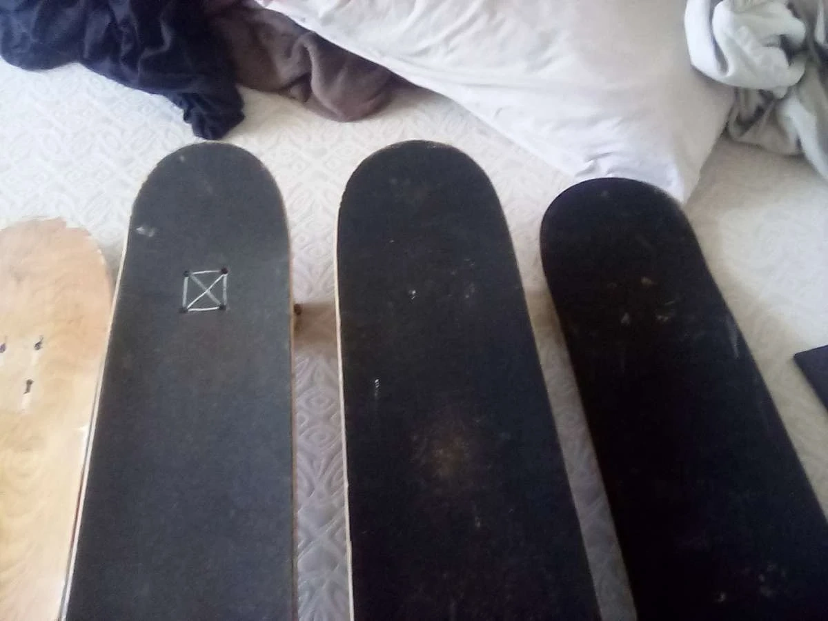Four skateboard decks are up for grabs. Includes blank decks and decks with graphics. Some decks show signs of wear. Great for customization or replacement parts!