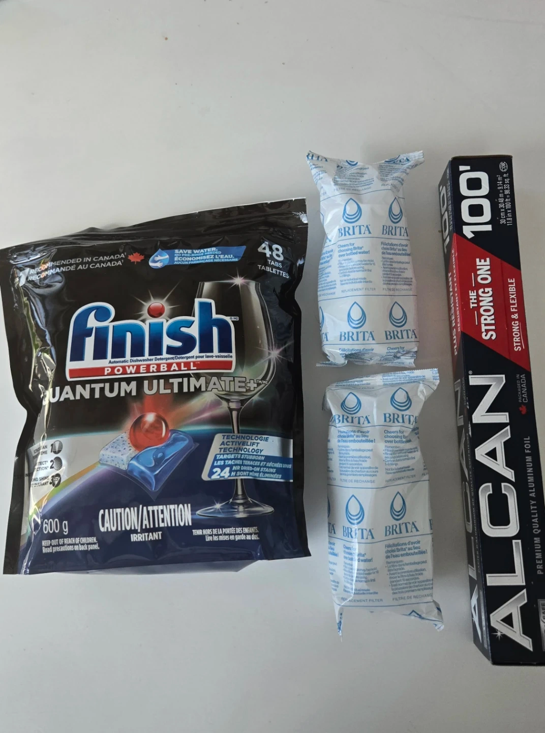 Includes 48 Finish Quantum Ultimate+ dishwasher tabs and three Brita water filters. Also comes with a roll of Alcan The Strong One aluminum foil, 100 sq ft. Great for kitchen needs!