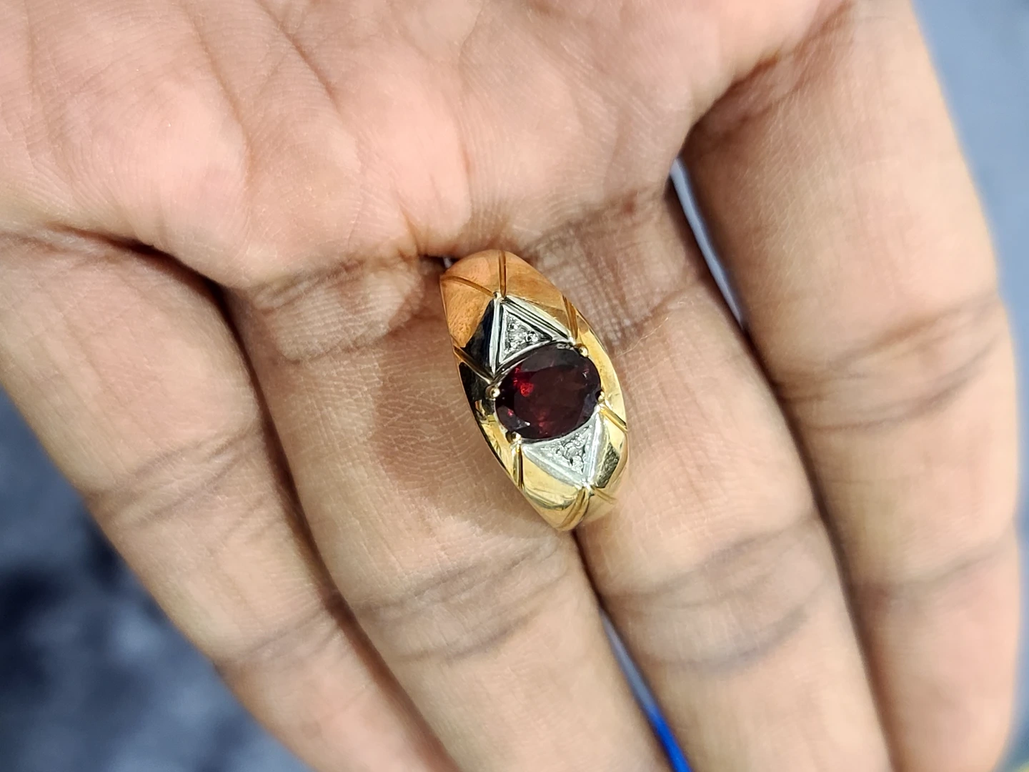 A beautiful 10K gold ring featuring a deep red garnet and small accent diamonds. This ring weighs 2.84 grams. It's a unique piece with a classic design.