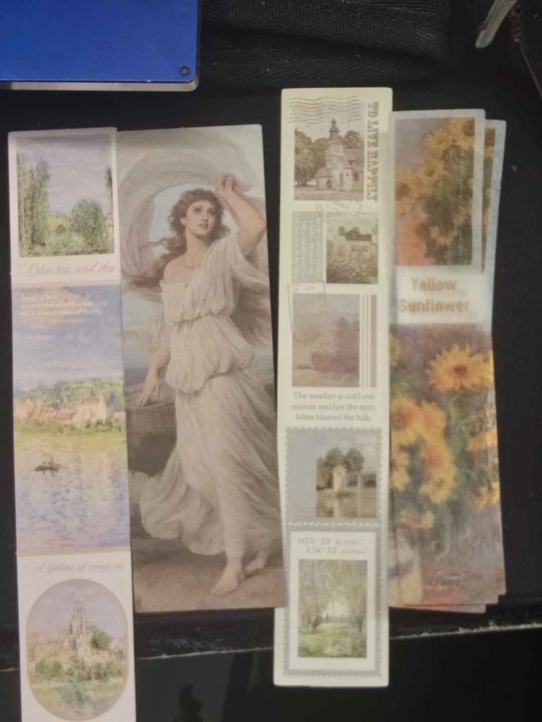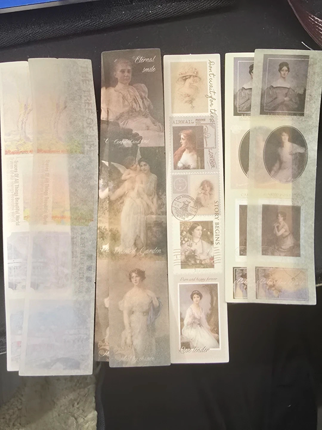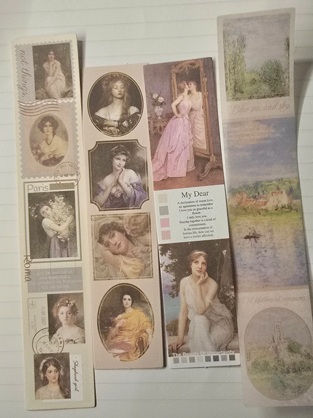 A set of decorative stickers featuring vintage art and nature scenes for journalling & etc. Designs include classical paintings, landscapes, and floral motifs.