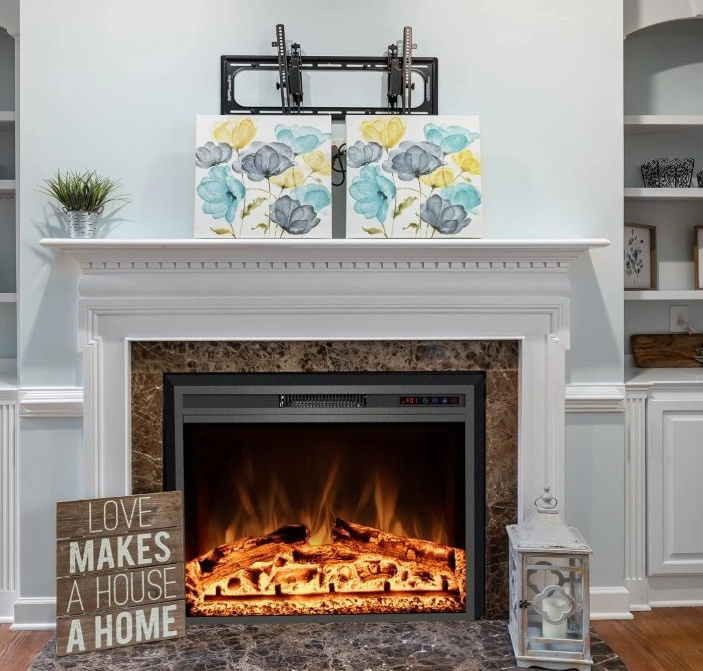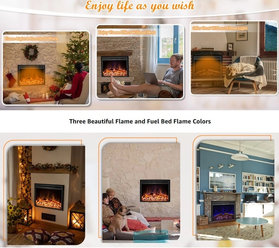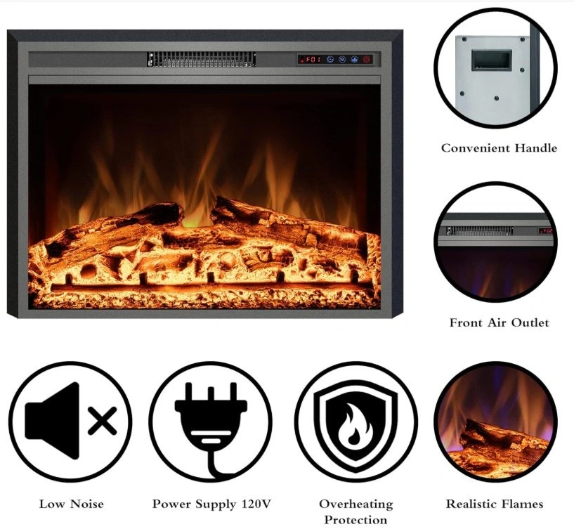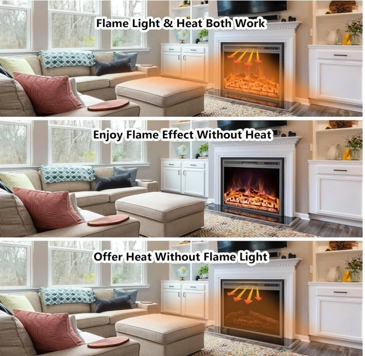 Easy to install, just insert the fireplace into your mantle for a space-saving setup. It plugs into a standard 120V AC outlet. Features realistic flame effects with 3 color options and 2 heat settings (1500W/750W) to suit different room sizes. You can enjoy the ambiance with or without heat. The built-in 1-9 hour timer is convenient and energy-saving. All functions are easily controlled via the remote or the control panel, with status shown on the LCD display. This electric stove offers a classic design with simulated wood and lifelike flames for an immersive experience, without the mess or danger of traditional fireplaces. It operates quietly for a comfortable and cozy environment. Its vintage appearance makes it suitable for TV cabinets, fireplace walls, or bookshelves.