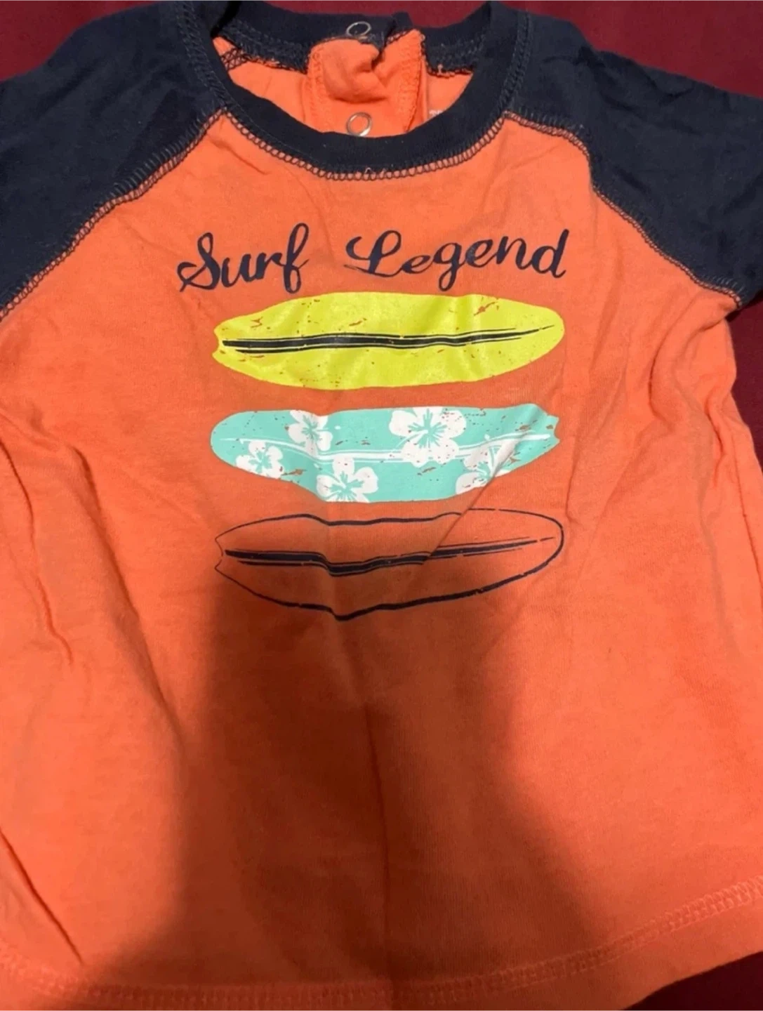 This cute orange raglan t-shirt has "Surf Legend" printed on the front with three surfboards. It's made of a soft cotton blend for comfort. This shirt is great for a little one who loves the beach vibe!