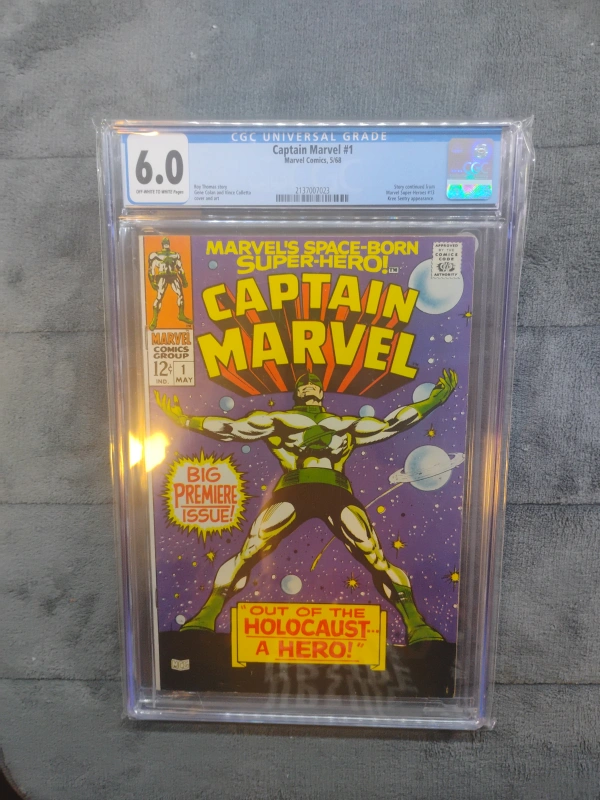 104Selling a CGC Universal Grade Captain Marvel #1 comic book. It's graded at 6.0. This is from Marvel Comics, May 1968. A big premiere issue!