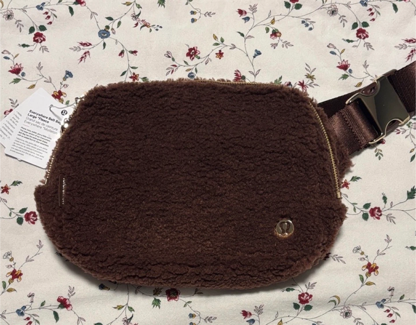 Lululemon belt bag in a cozy fleece material. It's a large size, perfect for keeping essentials close by. Features a zippered main compartment and an adjustable strap.