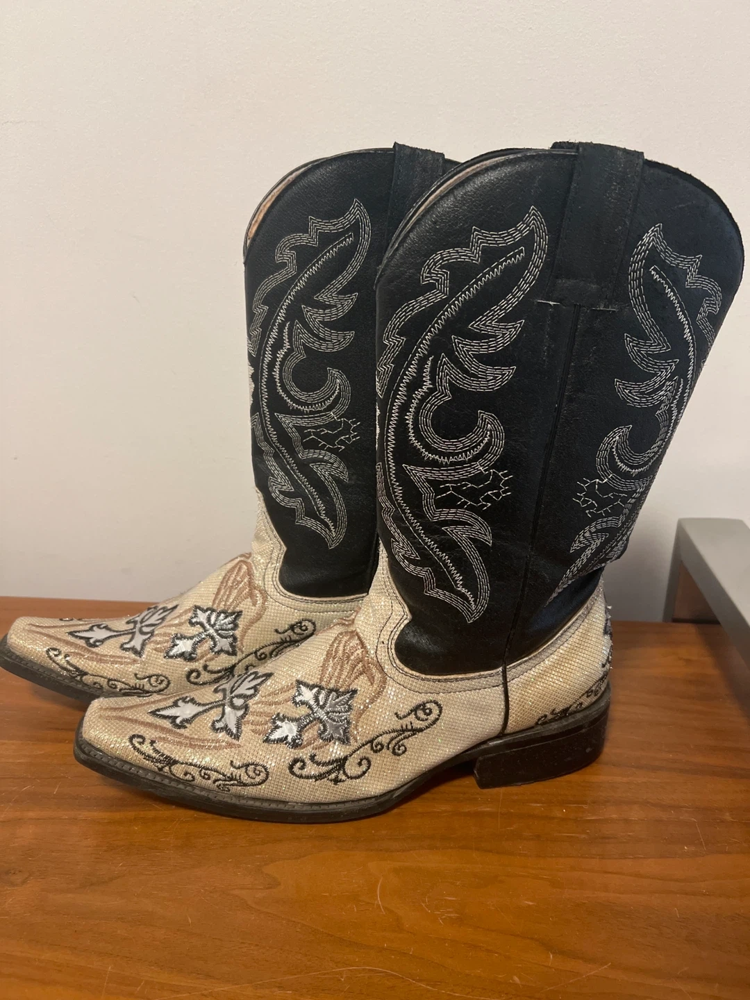 Stylish cowboy boots with intricate embroidery. Features a black shaft and a shimmering patterned foot. These boots are perfect for adding a western flair to your outfit!