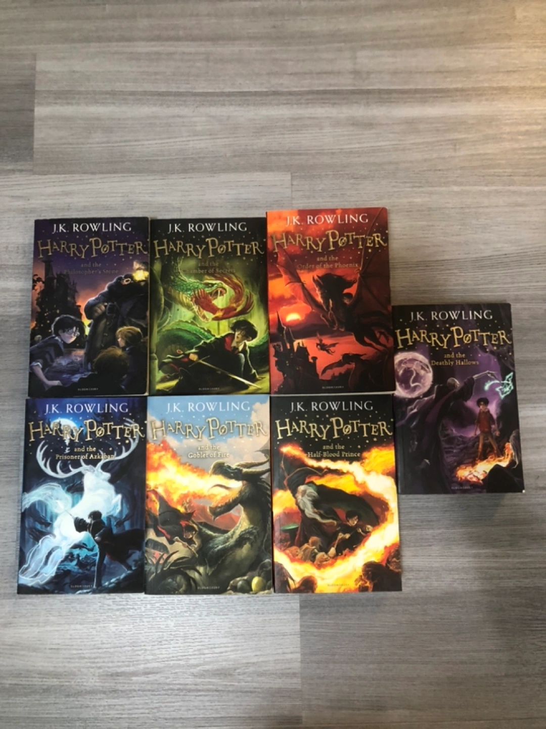 Full Harry Potter book series in good condition with slight wear and tear.