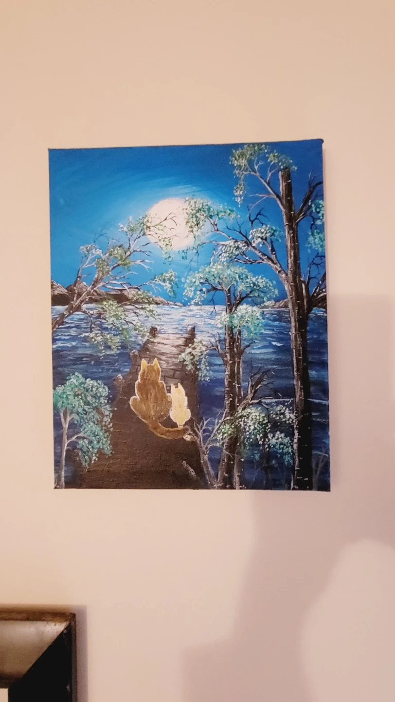 This painting depicting a mother cat and her kitten sitting on a dock surrounded by nature, looking out at the water under a full moon. It's a serene scene with trees and mountains in the background. The artwork is ready to hang and would make a lovely addition to any room. Unframed