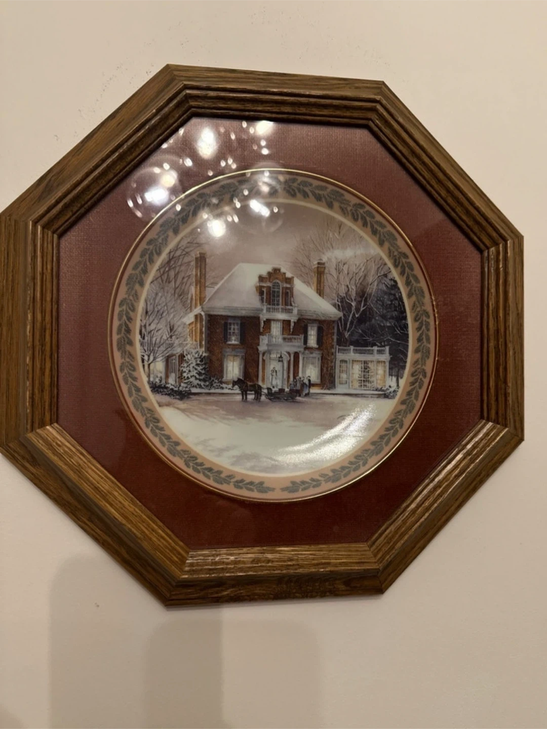 This decorative plate features an original painting by Trisha Romance, titled "Winter Fantasy". It's part of a limited edition and is strictly for decorative use, not for food consumption. The plate is framed and ready to hang.