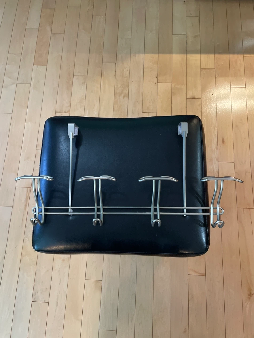 This over-the-door organizer rack features six hooks for hanging coats, bags, or towels. It's made of metal and is designed to fit over standard doors. Great for entryways or bedrooms needing extra storage!