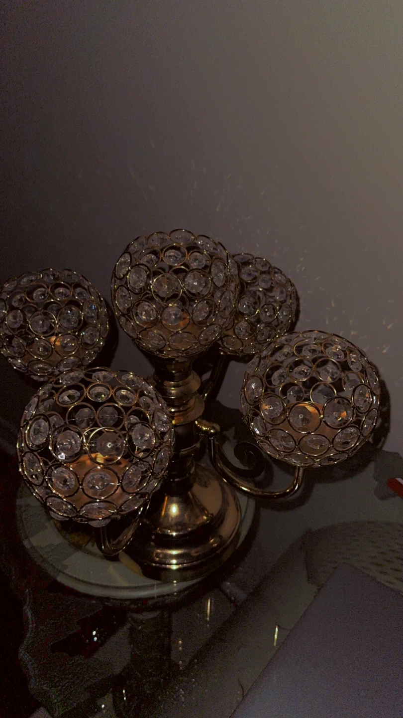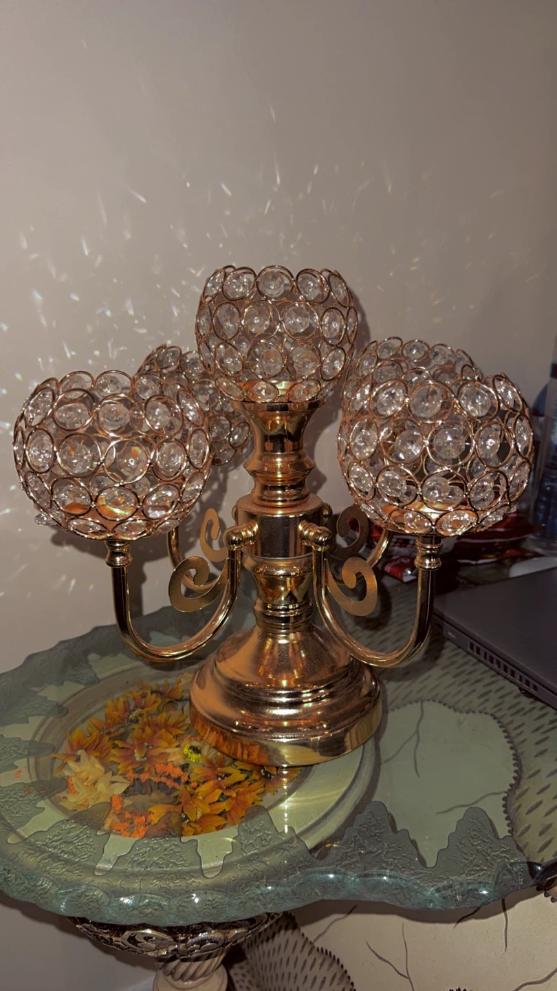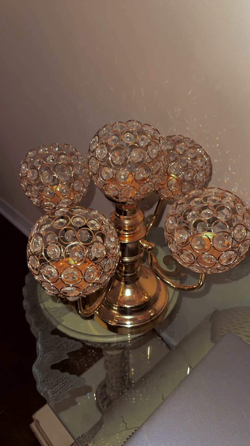 Selling a beautiful gold crystal candle holder. It has a very elegant design and would look great as a centrepiece or decorative item in any room. It holds multiple candles.