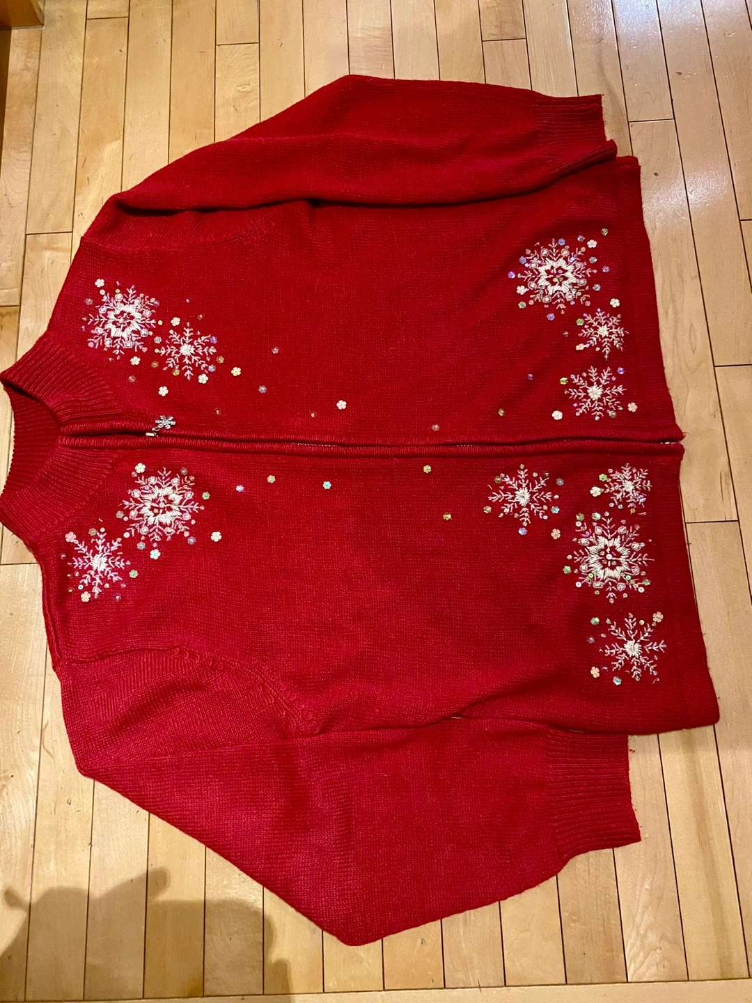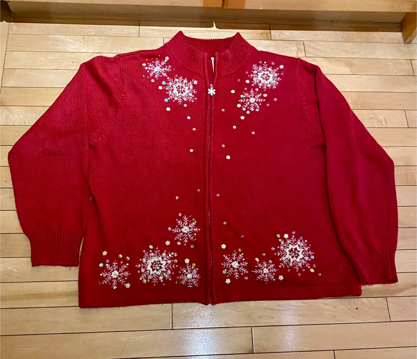Cozy red zip-up sweater adorned with sparkly snowflake appliques and embellishments. It features a stand-up collar and long sleeves with ribbed cuffs. Perfect for holiday gatherings or adding some festive cheer to your winter wardrobe!